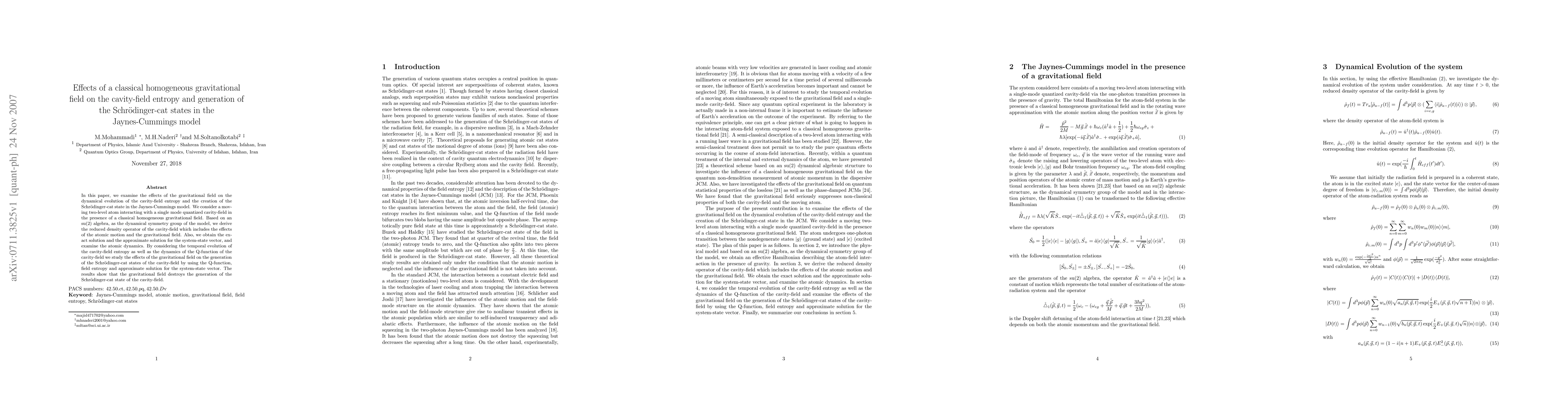 This paper investigates how a classical homogeneous gravitational field influences the cavity-field entropy and the formation of Schrödinger-cat states in the Jaynes-Cummings model, revealing that the gravitational field disrupts the generation of these states.