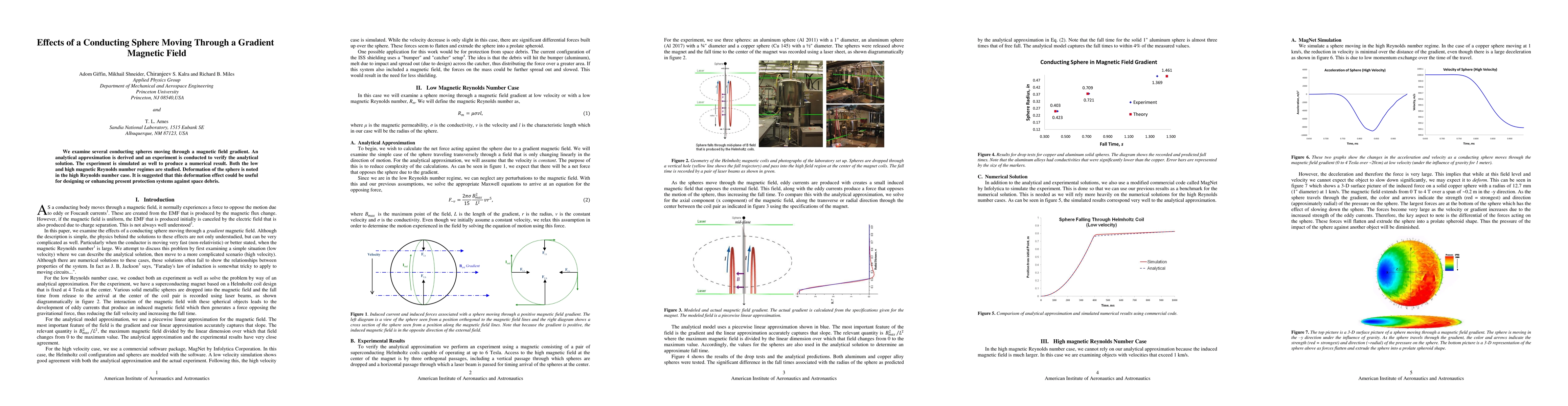 We examine several conducting spheres moving through a magnetic field gradient. An analytical approximation is derived and an experiment is conducted to verify the analytical solution. The experiment is simulated as well to produce a numerical result. Both the low and high magnetic Reynolds number regimes are studied. Deformation of the sphere is noted in the high Reynolds number case. It is suggested that this deformation effect could be useful for designing or enhancing present protection systems against space debris.
