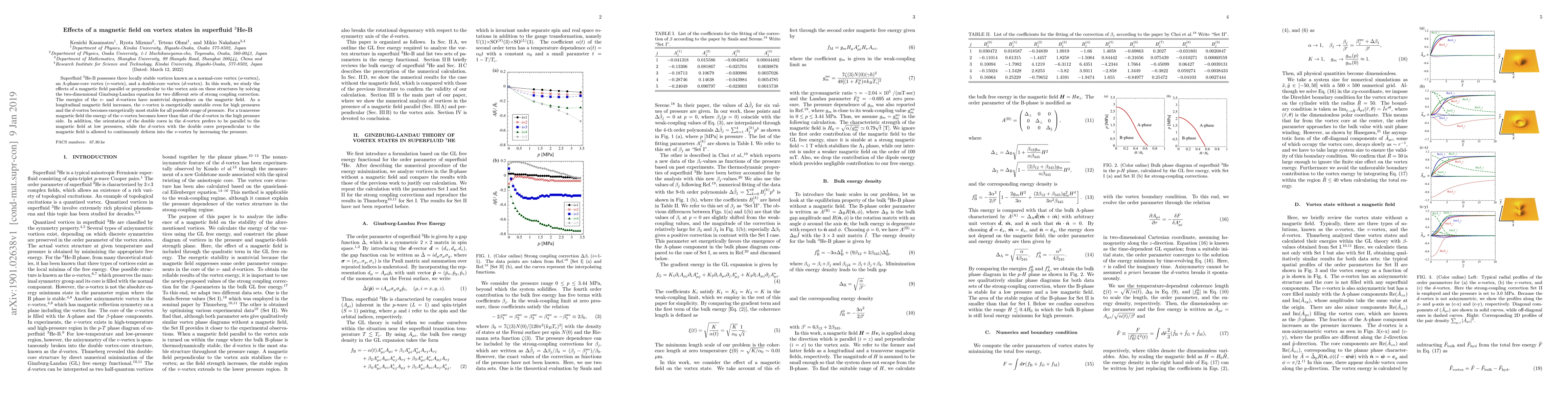 This paper investigates how magnetic fields affect the three vortex states in superfluid $^3$He-B, finding that the $v$-vortex becomes unstable under longitudinal fields while the $d$-vortex is most stable. Transverse fields lower the $v$-vortex energy at high pressures, and the $d$-vortex's double cores align with the field at low pressures.