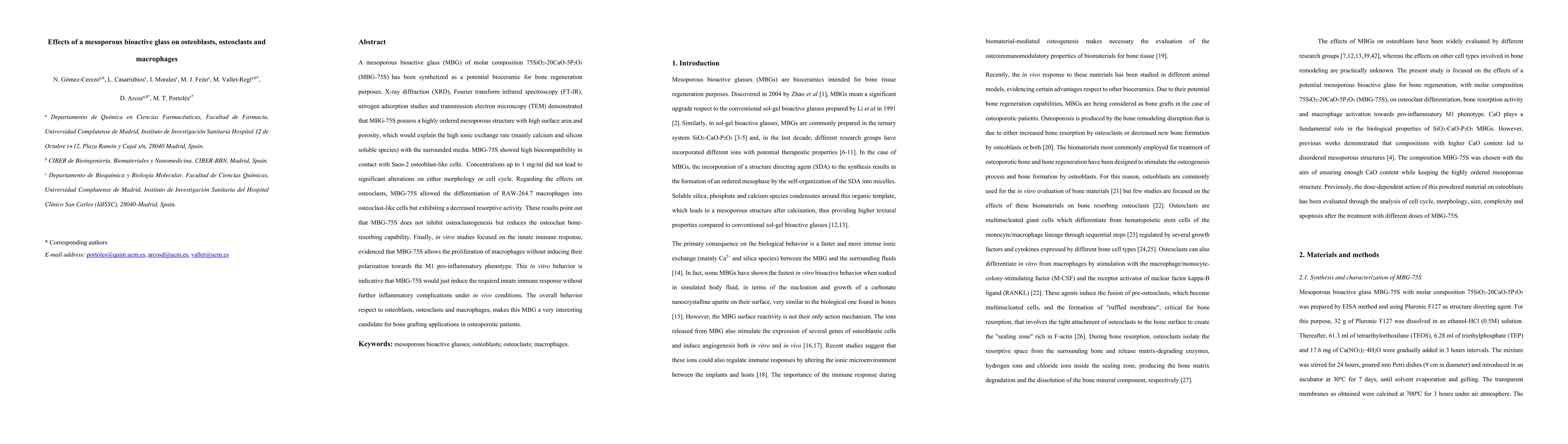 A mesoporous bioactive glass (MBG) of molar composition 75SiO2-20CaO-5P2O5 (MBG-75S) has been synthetized as a potential bioceramic for bone regeneration purposes. X-ray diffraction (XRD), Fourier transform infrared spectroscopy (FT-IR), nitrogen adsorption studies and transmission electron microscopy (TEM) demonstrated that MBG-75Spossess a highly ordered mesoporous structure with high surface area and porosity, which would explain the high ionic exchange rate (mainly calcium and silicon soluble species) with the surrounded media. MBG-75S showed high biocompatibility in contact with Saos-2 osteoblast-like cells. Concentrations up to 1 mg/ml did not lead to significant alterations on either morphology or cell cycle. Regarding the effects on osteoclasts, MBG-75S allowed the differentiation of RAW-264.7 macrophages into osteoclast-like cells but exhibiting a decreased resorptive activity. These results point out that MBG-75S does not inhibit osteoclastogenesis but reduces the osteoclast boneresorbing capability. Finally, in vitro studies focused on the innate immune response, evidenced that MBG-75S allows the proliferation of macrophages without inducing their polarization towards the M1 pro-inflammatory phenotype. This in vitro behavior is indicative that MBG-75S would just induce the required innate immune response without further inflammatory complications under in vivo conditions. The overall behavior respect to osteoblasts, osteoclasts and macrophages, makes this MBG a very interesting candidate for bone grafting applications in osteoporotic patients.
