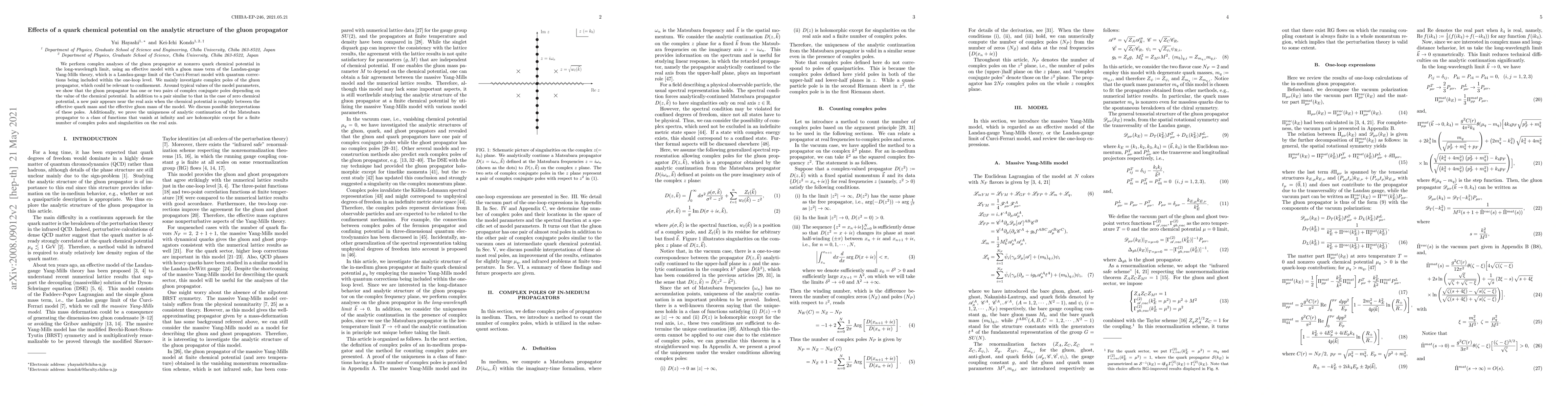 This paper analyzes the gluon propagator's complex poles at nonzero quark chemical potential in the long-wavelength limit, revealing one or two pairs of complex conjugate poles depending on the chemical potential value. The study discusses the implications for confinement and the uniqueness of analytic continuation of the propagator.