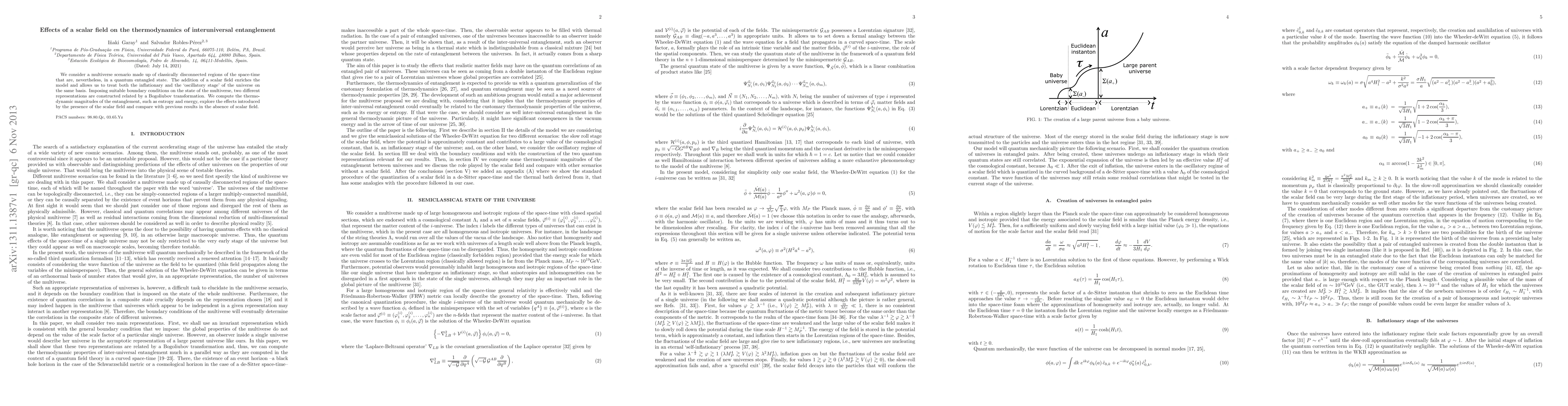We consider a multiverse scenario made up of classically disconnected regions of the space-time that are, nevertheless, in a quantum entangled state. The addition of a scalar field enriches the model and allows us to treat both the inflationary and the `oscillatory stage' of the universe on the same basis. Imposing suitable boundary conditions on the state of the multiverse, two different representations are constructed related by a Bogoliubov transformation. We compute the thermodynamic magnitudes of the entanglement, such as entropy and energy, explore the effects introduced by the presence of the scalar field and compare with previous results in the absence of scalar field.
