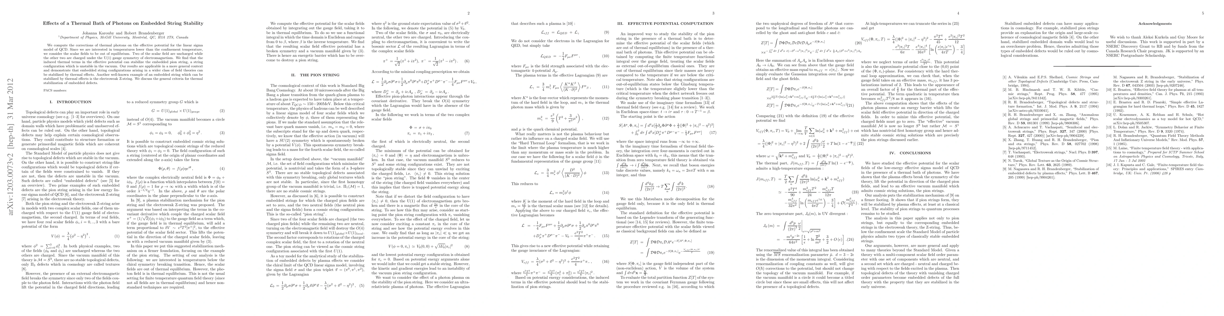 We compute the corrections of thermal photons on the effective potential for the linear sigma model of QCD. Since we are interested in temperatures lower than the confinement temperature, we consider the scalar fields to be out of equilibrium. Two of the scalar field are uncharged while the other two are charged under the U(1) gauge symmetry of electromagnetism. We find that the induced thermal terms in the effective potential can stabilize the embedded pion string, a string configuration which is unstable in the vacuum. Our results are applicable in a more general context and demonstrate that embedded string configurations arising in a wider class of field theories can be stabilized by thermal effects. Another well-known example of an embedded string which can be stabilized by thermal effects is the electroweak Z-string. We discuss the general criteria for thermal stabilization of embedded defects.