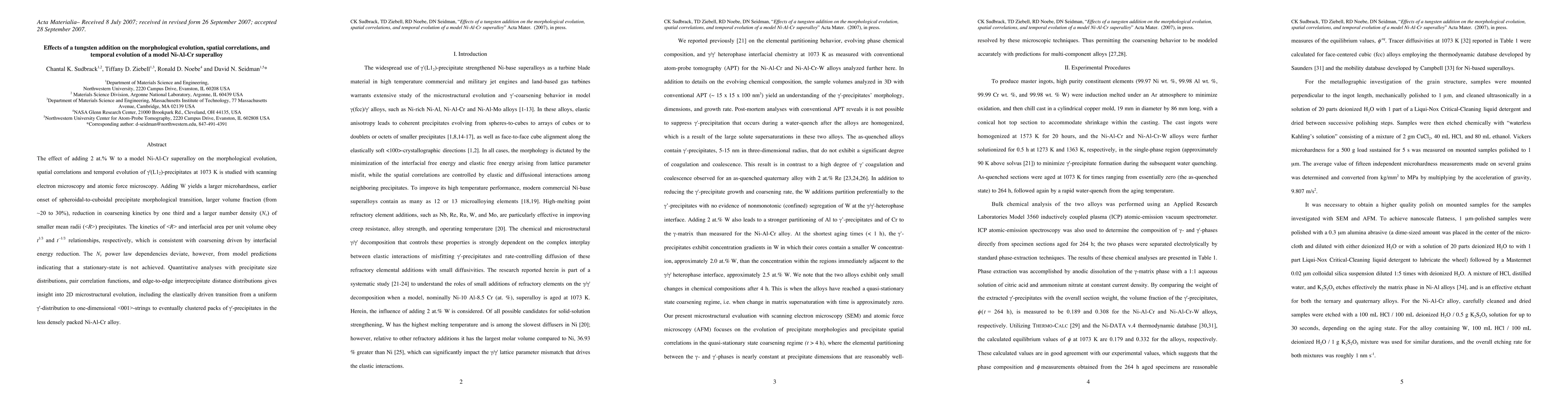 This study investigates the impact of adding 2 at.% W to a Ni-Al-Cr superalloy, revealing enhanced microhardness, accelerated morphological transition, and reduced coarsening kinetics, while also detailing the spatial and temporal evolution of g'(L12)-precipitates through advanced microscopy techniques.