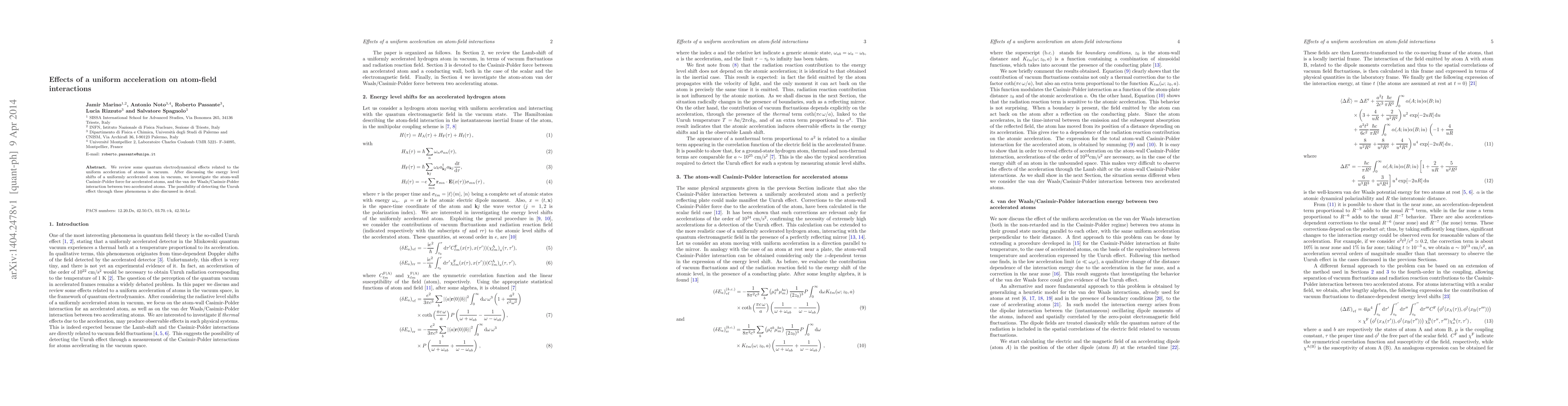 This paper reviews quantum electrodynamical effects of uniformly accelerated atoms in vacuum, focusing on energy level shifts, atom-wall Casimir-Polder forces, and van der Waals interactions between accelerated atoms, with a detailed discussion on detecting the Unruh effect through these phenomena.