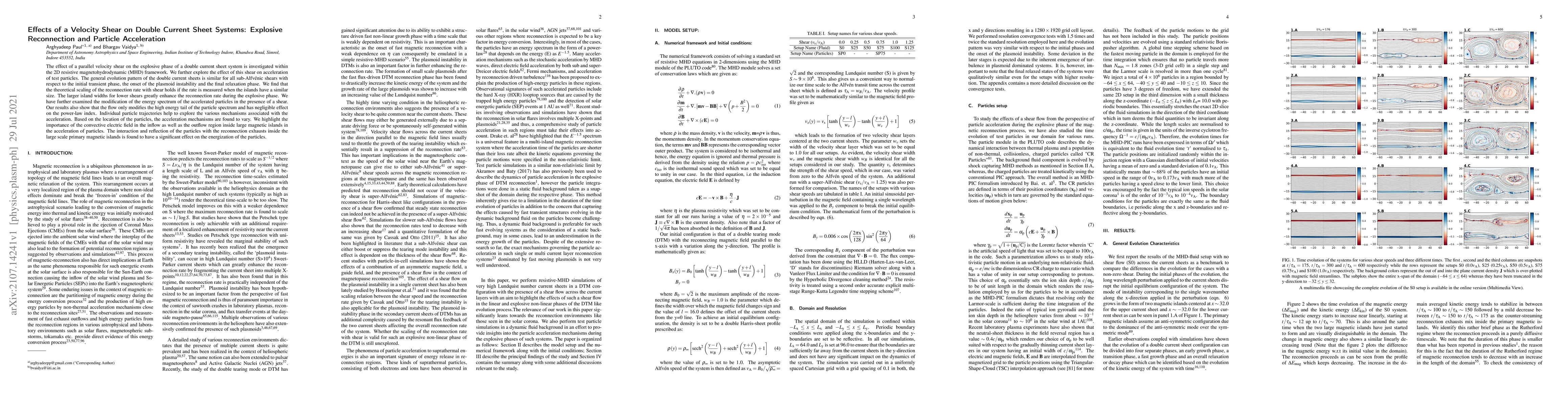 The effect of a parallel velocity shear on the explosive phase of a double current sheet system is investigated within the 2D resistive magnetohydrodynamic (MHD) framework. We further explore the effect of this shear on acceleration of test particles. The general evolution pattern of the double current sheets is similar for all sub-Alfv\'enic shears with respect to the initial transient phase, the onset of the plasmoid instability and the final relaxation phase. We find that the theoretical scaling of the reconnection rate with shear holds if the rate is measured when the islands have a similar size. The larger island widths for lower shears greatly enhance the reconnection rate during the explosive phase. We have further examined the modification of the energy spectrum of the accelerated particles in the presence of a shear. Our results also show that the flow only modifies the high energy tail of the particle spectrum and has negligible effect on the power-law index. Individual particle trajectories help to explore the various mechanisms associated with the acceleration. Based on the location of the particles, the acceleration mechanisms are found to vary. We highlight the importance of the convective electric field in the inflow as well as the outflow region inside large magnetic islands in the acceleration of particles. The interaction and reflection of the particles with the reconnection exhausts inside the large scale primary magnetic islands is found to have a significant effect on the energization of the particles.