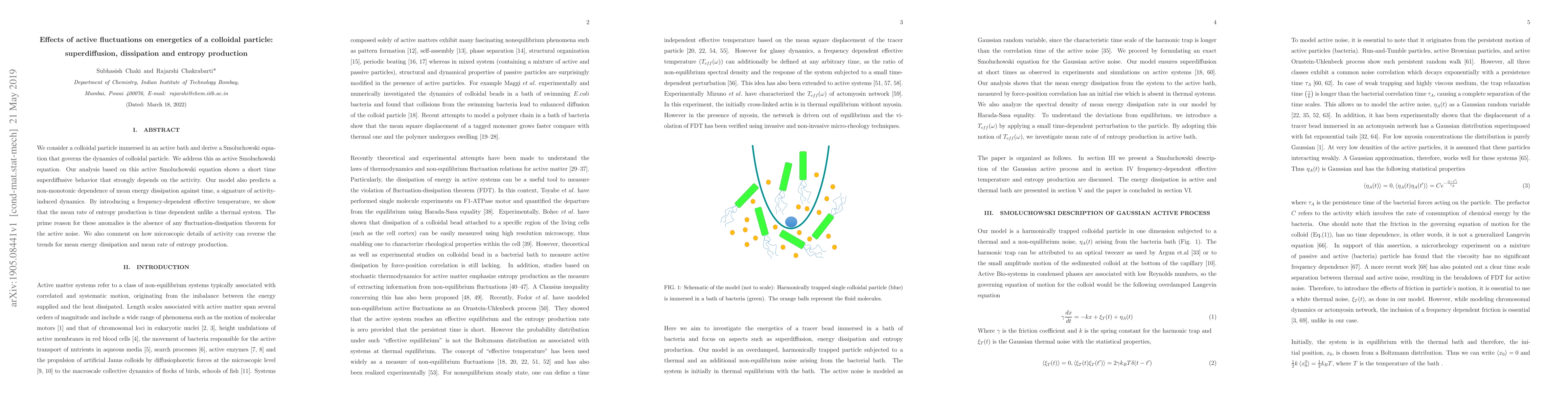 We consider a colloidal particle immersed in an active bath and derive a Smoluchowski equation that governs the dynamics of colloidal particle. We address this as active Smoluchowski equation. Our analysis based on this active Smoluchowski equation shows a short time superdiffusive behavior that strongly depends on the activity. Our model also predicts a non-monotonic dependence of mean energy dissipation against time, a signature of activity-induced dynamics. By introducing a frequency-dependent effective temperature, we show that the mean rate of entropy production is time dependent unlike a thermal system. The prime reason for these anomalies is the absence of any fluctuation-dissipation theorem for the active noise. We also comment on how microscopic details of activity can reverse the trends for mean energy dissipation and mean rate of entropy production.