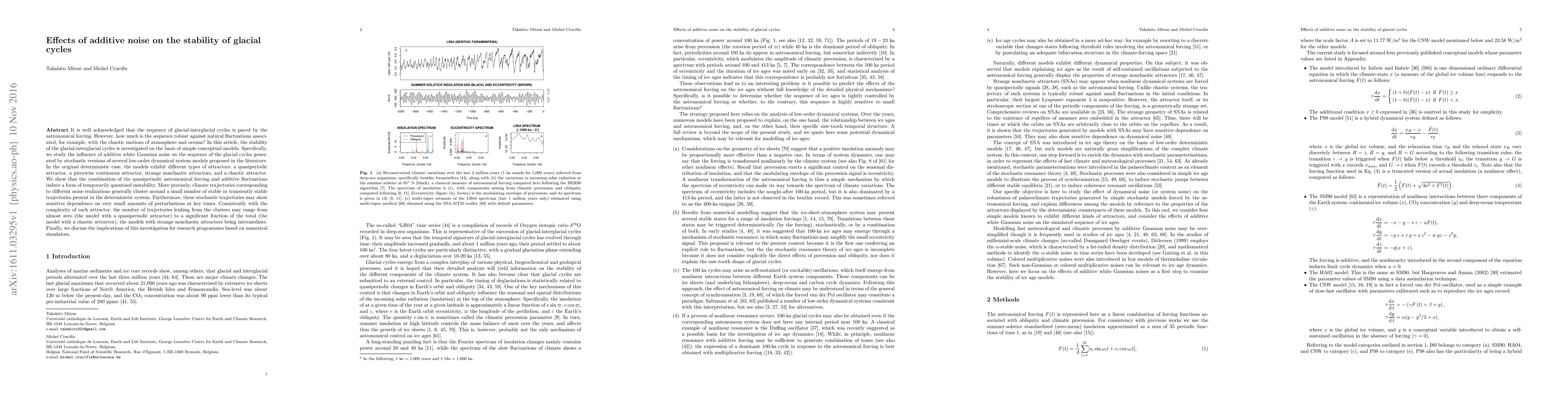 This paper investigates how additive white Gaussian noise affects the stability of glacial cycles using stochastic versions of low-order dynamical system models. It finds that while noise induces temporarily quantised instability, climate trajectories generally cluster around stable or transiently stable paths, with the degree of leakage from these clusters varying based on the complexity of the model's attractor.