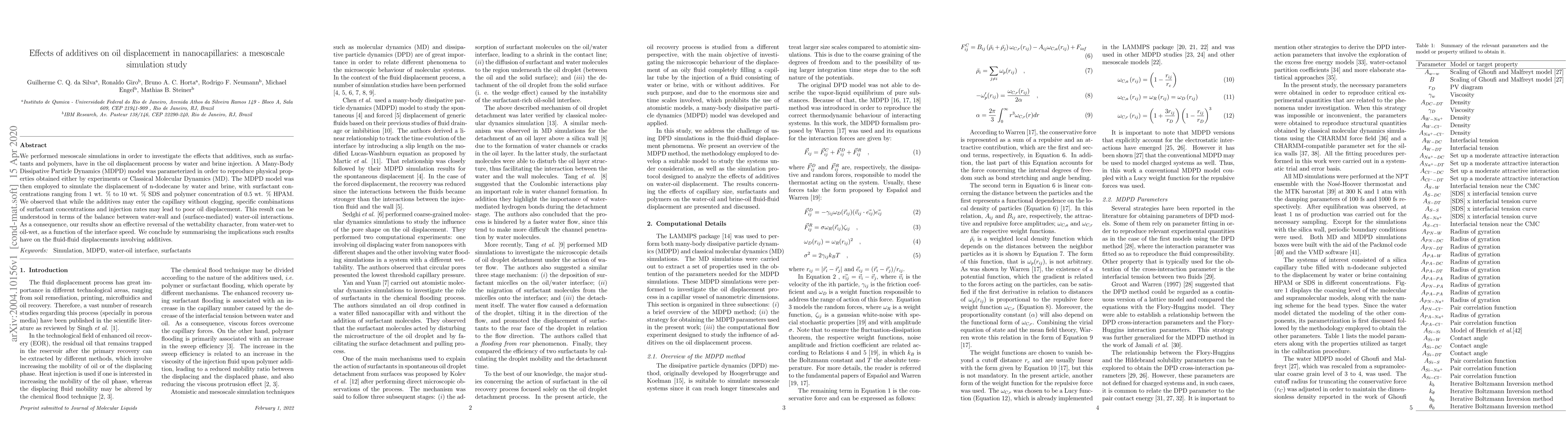 We performed mesoscale simulations in order to investigate the effects that additives, such as surfactants and polymers, have in the oil displacement process by water and brine injection. A Many-Body Dissipative Particle Dynamics (MDPD) model was parameterized in order to reproduce physical properties obtained either by experiments or Classical Molecular Dynamics (MD). The MDPD model was then employed to simulate the displacement of n-dodecane by water and brine, with surfactant concentrations ranging from 1 wt. % to 10 wt. % SDS and polymer concentration of 0.5 wt. % HPAM. We observed that while the additives may enter the capillary without clogging, specific combinations of surfactant concentrations and injection rates may lead to poor oil displacement. This result can be understood in terms of the balance between water-wall and (surface-mediated) water-oil interactions. As a consequence, our results show an effective reversal of the wettability character, from water-wet to oil-wet, as a function of the interface speed. We conclude by summarizing the implications such results have on the fluid-fluid displacements involving additives.