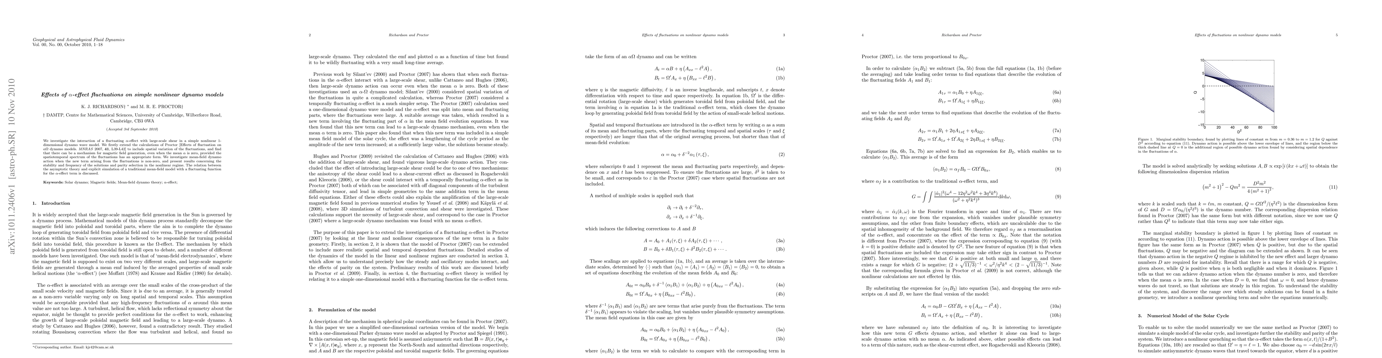 We investigate the interaction of a fluctuating alpha-effect with large-scale shear in a simple nonlinear 1-dimensional dynamo wave model. We firstly extend the calculations of Proctor (2007, MNRAS, 41, L39-L42) to include spatial variation of the fluctuations, and find that there can be a mechanism for magnetic field generation, even when the mean alpha is zero, provided the spatiotemporal spectrum of the fluctuations has an appropriate form. We investigate mean-field dynamo action when the new term arising from the fluctuations is non-zero, and present results concerning the stability and frequency of the solutions and parity selection in the nonlinear regime. The relation between the asymptotic theory and explicit simulation of a traditional mean-field model with a fluctuating function for the alpha-effect term is discussed.