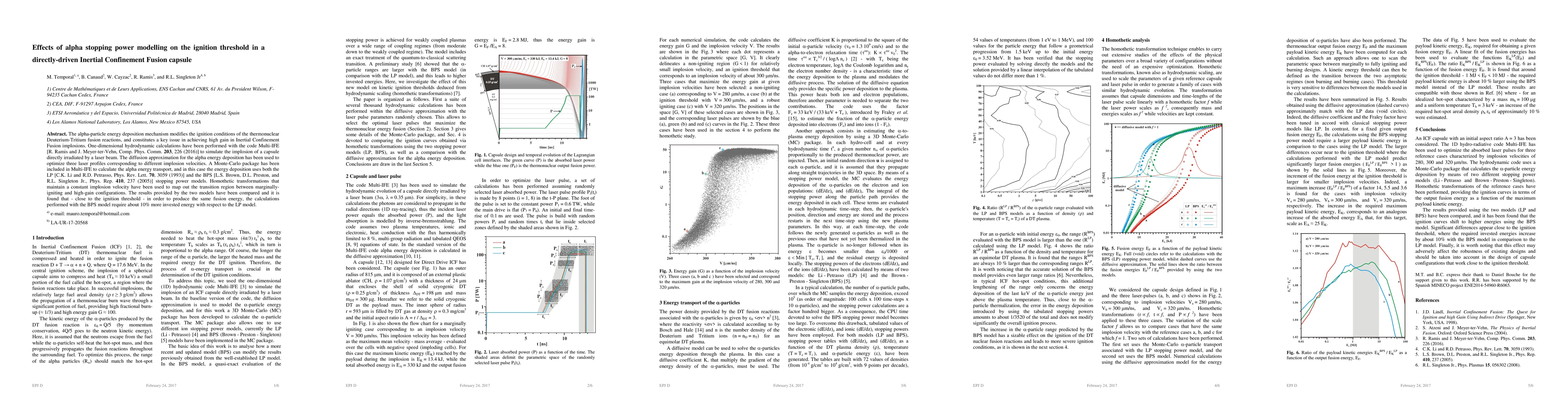 This study investigates the effects of different alpha stopping power models on the ignition threshold in directly-driven Inertial Confinement Fusion capsules. Using the Multi-IFE code, simulations show that the BPS model requires about 10% more energy than the LP model to achieve the same fusion energy near the ignition threshold.