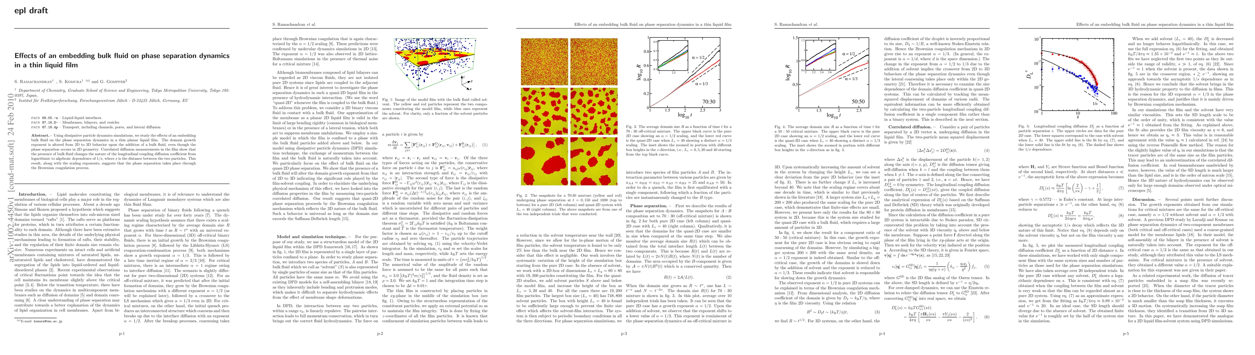 Using dissipative particle dynamics simulations, we study the effects of an embedding bulk fluid on the phase separation dynamics in a thin planar liquid film. The domain growth exponent is altered from 2D to 3D behavior upon the addition of a bulk fluid, even though the phase separation occurs in 2D geometry. Correlated diffusion measurements in the film show that the presence of bulk fluid changes the nature of the longitudinal coupling diffusion coefficient from logarithmic to algebraic dependence of 1/s, where s is the distance between the two particles. This result, along with the scaling exponents, suggests that the phase separation takes place through the Brownian coagulation process.