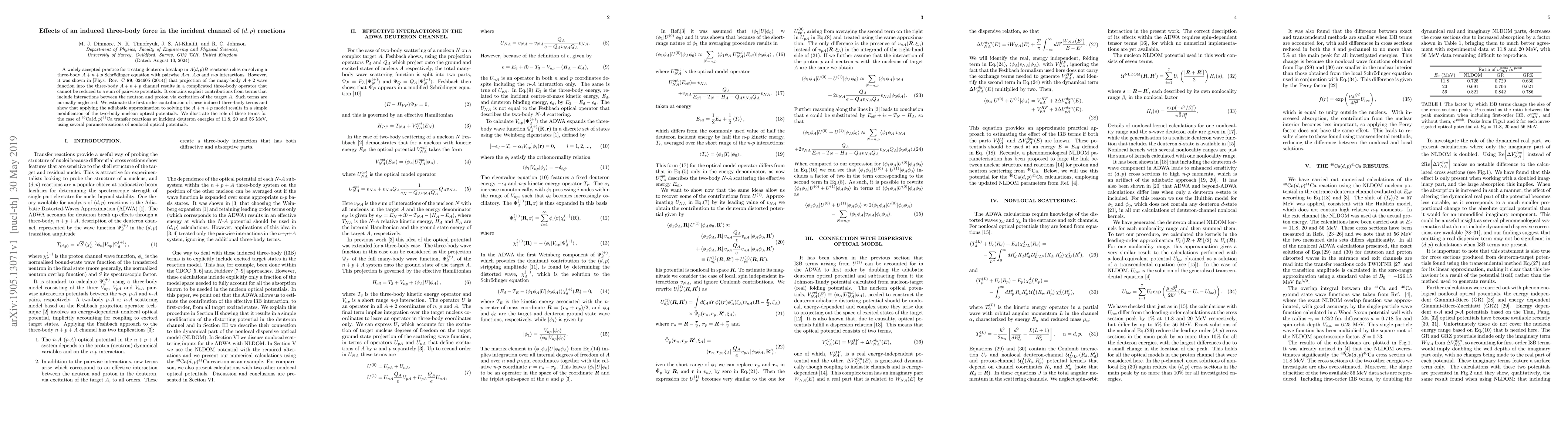 This paper investigates the impact of an induced three-body force in the reaction $A(d,p)B$, showing that it modifies the two-body nucleon optical potentials when using the adiabatic approximation. The study demonstrates the significance of these terms through the example of $^{40}$Ca($d,p$)$^{41}$Ca reactions at various deuteron energies.