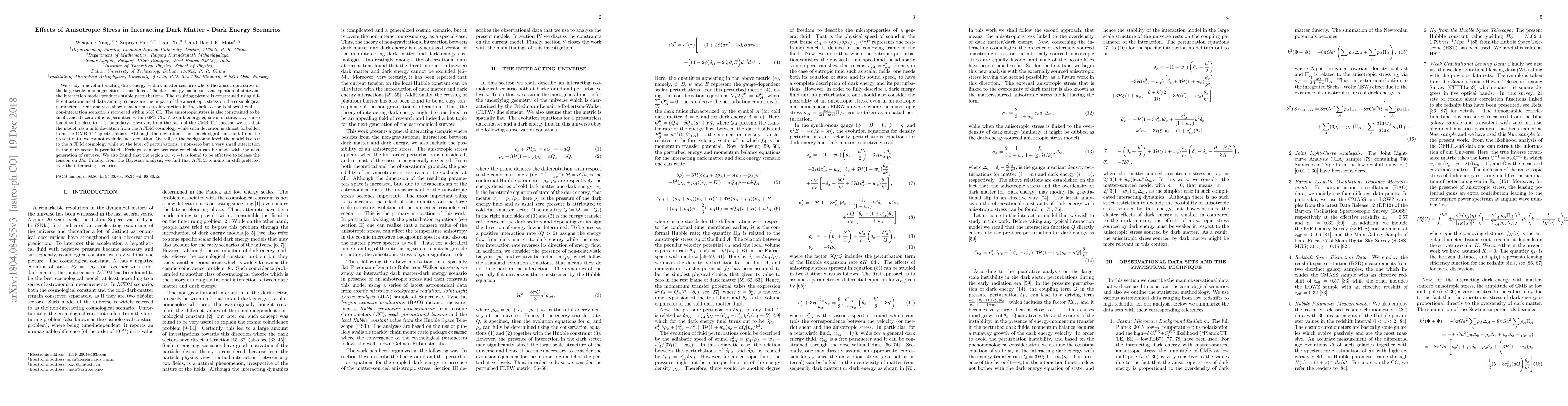 Researchers explore an interacting dark energy-dark matter scenario with anisotropic stress, finding a small but non-zero interaction allowed while the dark energy equation of state is close to -1, and suggesting that this model could help release tension on H0.
