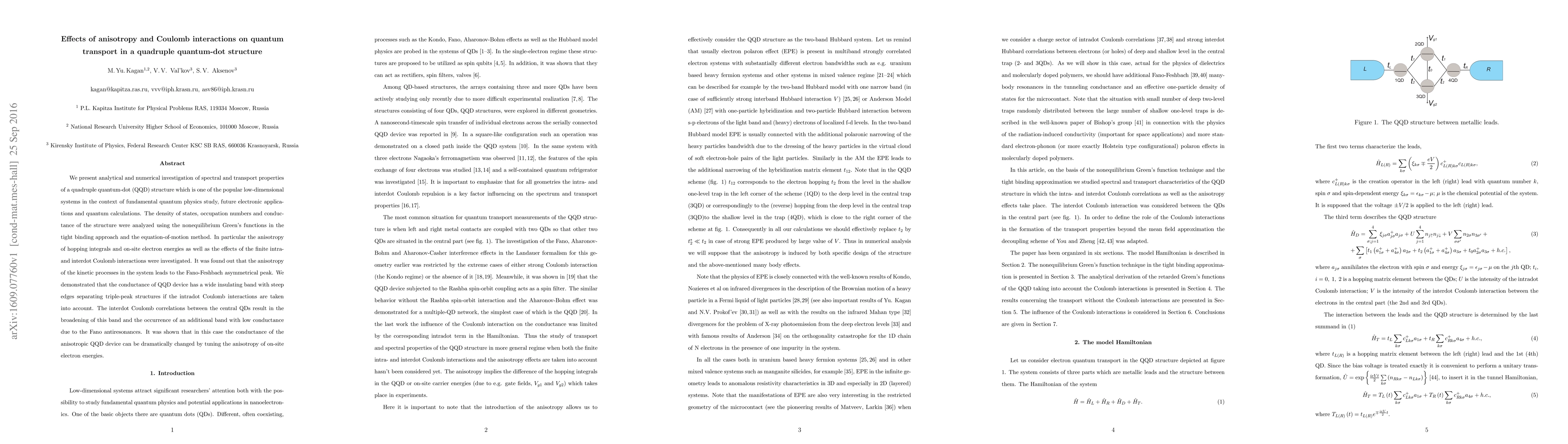 Researchers studied how anisotropy and Coulomb interactions affect quantum transport in a quadruple quantum-dot structure, finding that these factors can dramatically change the device's conductance and create new bands with varying properties.