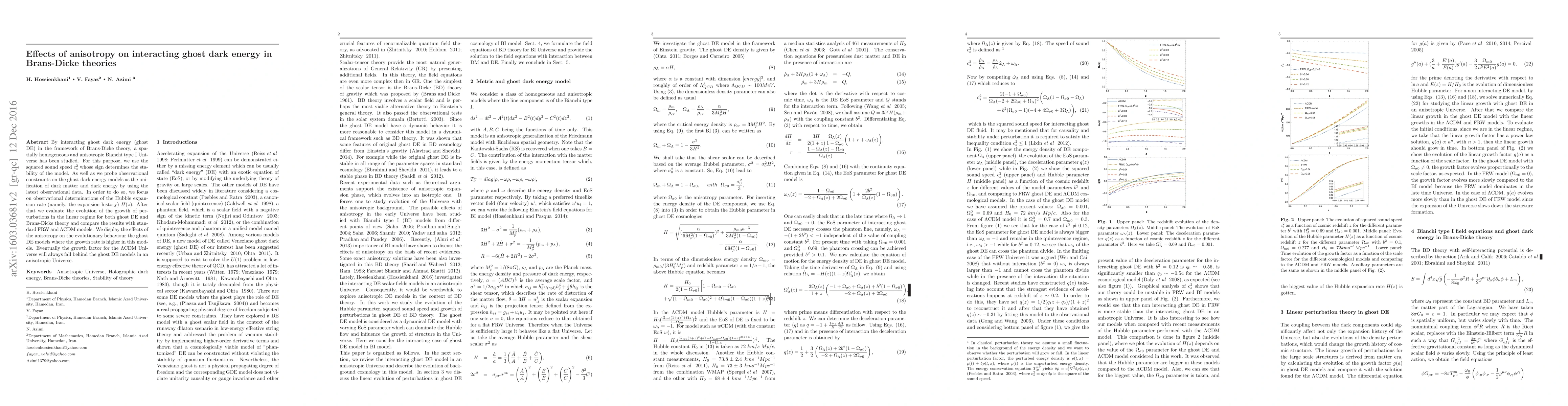 By interacting ghost dark energy (ghost DE) in the framework of Brans-Dicke theory, a spatially homogeneous and anisotropic Bianchi type I Universe has been studied. For this purpose, we use the squared sound speed $c_s^2$ whose sign determines the stability of the model. As well as we probe observational constraints on the ghost dark energy models as the unification of dark matter and dark energy by using the latest observational data. In order to do so, we focus on observational determinations of the Hubble expansion rate (namely, the expansion history) $H(z)$. After that we evaluate the evolution of the growth of perturbations in the linear regime for both ghost DE and Brans-Dicke theory and compare the results with standard FRW and $\Lambda$CDM models. We display the effects of the anisotropy on the evolutionary behavior the ghost DE models where the growth rate is higher in this models. Eventually the growth factor for the $\Lambda$CDM Universe will always fall behind the ghost DE models in an anisotropic Universe