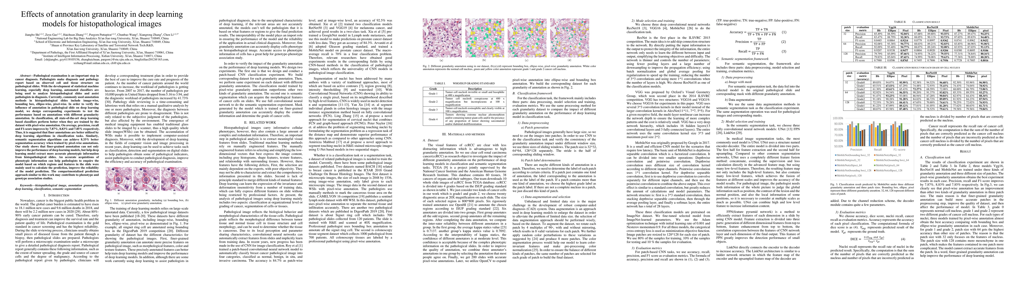 This study investigates how different levels of annotation granularity—from image-wise to pixel-wise—affect the performance of deep learning models in classifying and segmenting histopathological images. Results show that finer-grained pixel-wise annotations significantly improve classification and segmentation accuracy, suggesting that granular annotations enhance both model performance and phenotypic information extraction.