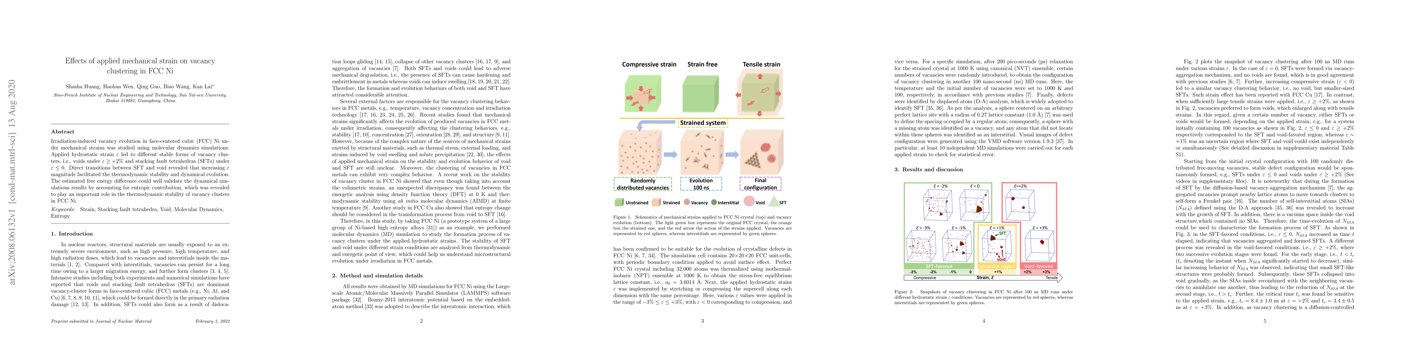 The study presents a detailed analysis of vacancy clustering in FCC Ni under various mechanical strains using molecular dynamics simulations, highlighting the role of entropic contributions in cluster stability.