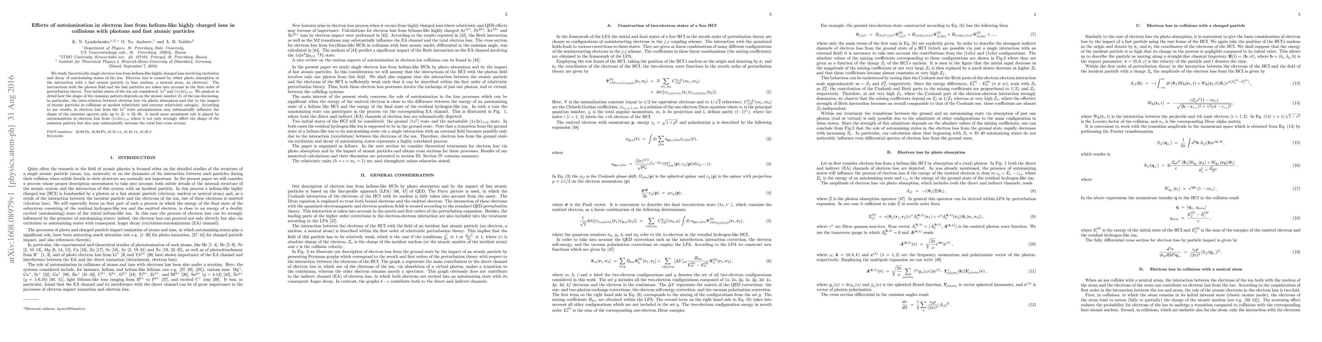 We study theoretically single electron loss from helium-like highly charged ions involving excitation and decay of autoionizing states of the ion. Electron loss is caused by either photo absorption or the interaction with a fast atomic particle (a bare nucleus, a neutral atom, an electron). The interactions with the photon field and the fast particles are taken into account in the first order of perturbation theory. Two initial states of the ion are considered: $1s^2$ and $(1s2s)_{J=0}$. We analyze in detail how the shape of the emission pattern depends on the atomic number $Z_{I}$ of the ion discussing, in particular, the inter-relation between electron loss via photo absorption and due to the impact of atomic particles in collisions at modest relativistic and extreme relativistic energies. According to our results, in electron loss from the $1s^2$ state autoionization may substantially influence the shape of the emission spectra only up to $Z_{I} \approx 35-40$. A much more prominent role is played by autoionization in electron loss from $(1s2s)_{J=0}$ where it not only strongly affect the shape of the emission pattern but also may substantially increase the total loss cross section.