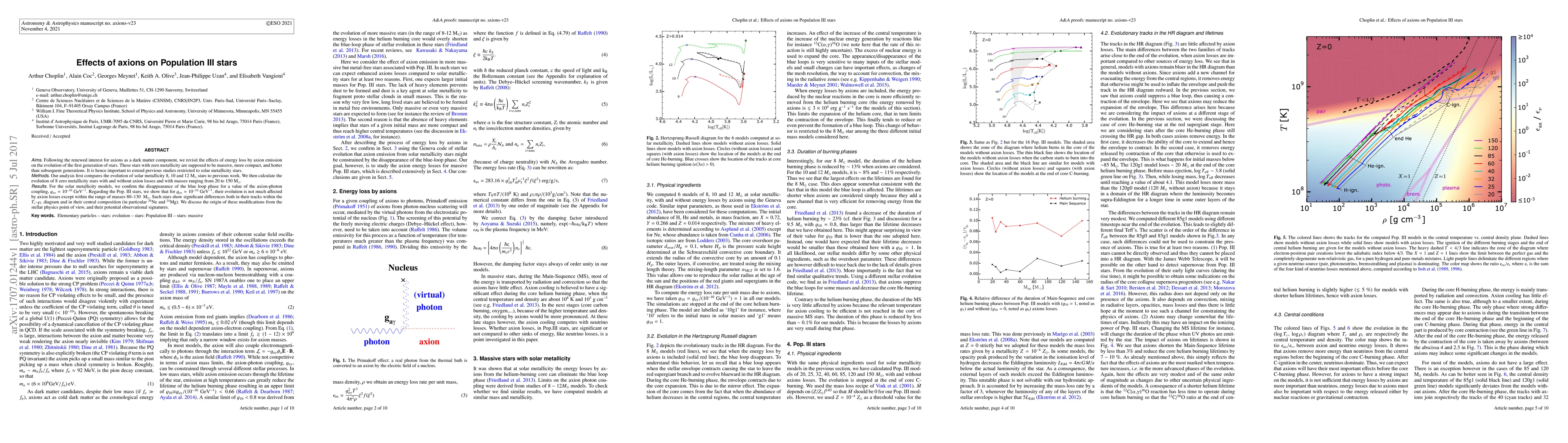 Following the renewed interest for axions as a dark matter component, we revisit the effects of energy loss by axion emission on the evolution of the first generation of stars. These stars with zero metallicity are supposed to be massive, more compact, and hotter than subsequent generations. It is hence important to extend previous studies restricted to solar metallicity stars. Our analysis first compares the evolution of solar metallicity 8, 10 and 12 M$_\odot$ stars to previous work. We then calculate the evolution of 8 zero metallicity stars with and without axion losses and with masses ranging from 20 to 150 M$_\odot$. For the solar metallicity models, we confirm the disappearance of the blue loop phase for a value of the axion-photon coupling, $g_{a\gamma}=10^{-10} {\rm GeV}^{-1}$. Regarding the Pop. III stars, we show that for $g_{a\gamma}=10^{-10} {\rm GeV}^{-1}$, their evolution is not much affected by axion losses except within the range of masses 80$-$130 M$_\odot$. Such stars show significant differences both in their tracks within the $T_c$-$\rho_c$ diagram and in their central composition (in particular $^{20}$Ne and $^{24}$Mg). We discuss the origin of these modifications from the stellar physics point of view, and their potential observational signatures.