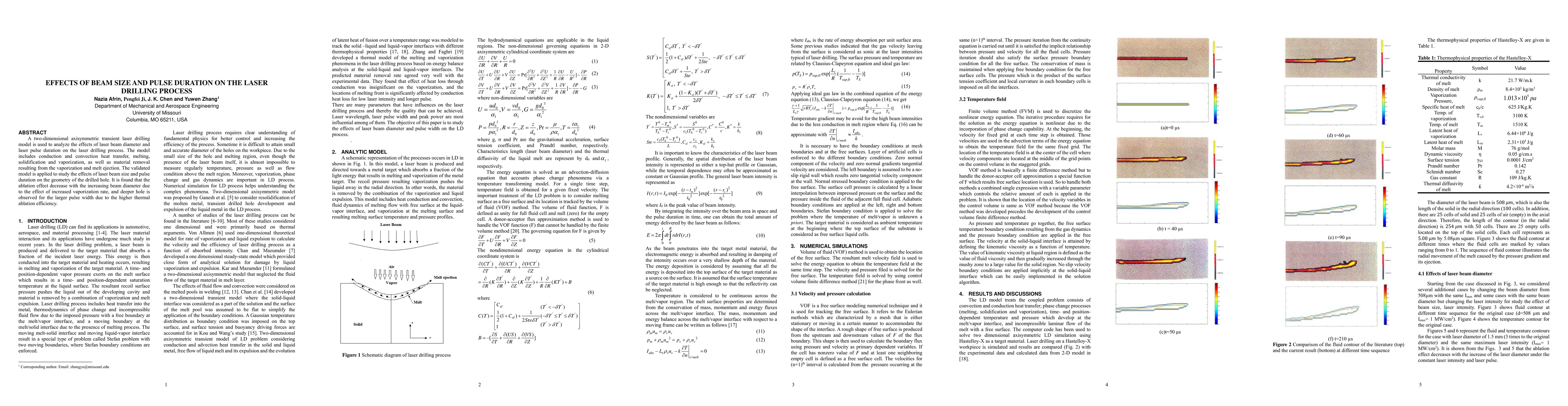 A two-dimensional axisymmetric transient laser drilling model is used to analyze the effects of laser beam diameter and laser pulse duration on the laser drilling process. The model includes conduction and convection heat transfer, melting, solidification and vaporization, as well as material removal resulting from the vaporization and melt ejection. The validated model is applied to study the effects of laser beam size and pulse duration on the geometry of the drilled hole. It is found that the ablation effect decrease with the increasing beam diameter due to the effect of increased vaporization rate, and deeper hole is observed for the larger pulse width due to the higher thermal ablation efficiency.