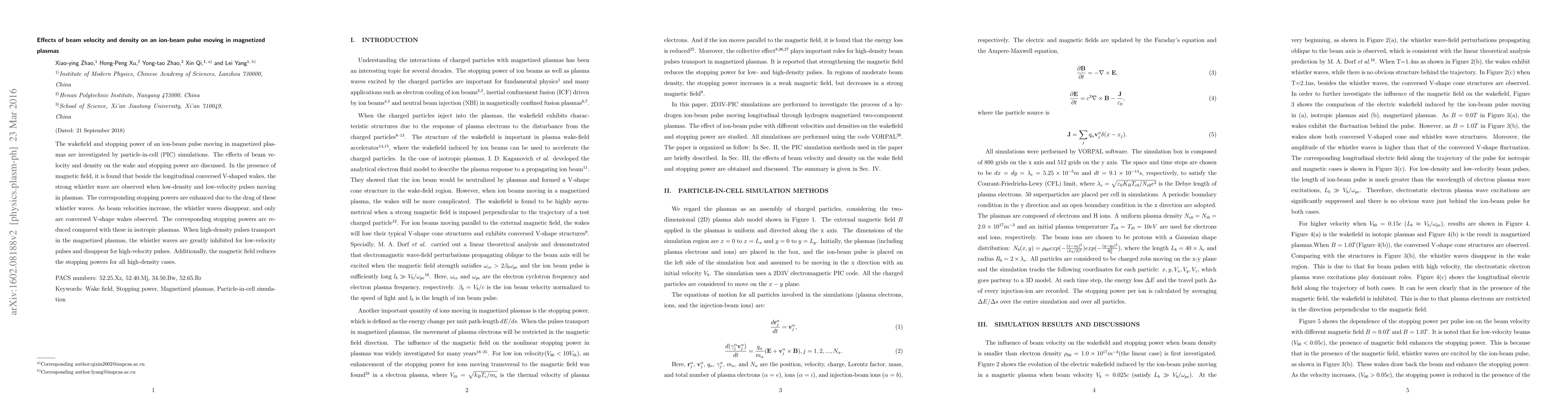 The wakefield and stopping power of an ion-beam pulse moving in magnetized plasmas are investigated by particle-in-cell (PIC) simulations. The effects of beam velocity and density on the wake and stopping power are discussed. In the presence of magnetic field, it is found that beside the longitudinal conversed V-shaped wakes, the strong whistler wave are observed when low-density and low-velocity pulses moving in plasmas. The corresponding stopping powers are enhanced due to the drag of these whistler waves. As beam velocities increase, the whistler waves disappear, and only are conversed V-shape wakes observed. The corresponding stopping powers are reduced compared with these in isotropic plasmas. When high-density pulses transport in the magnetized plasmas, the whistler waves are greatly inhibited for low-velocity pulses and disappear for high-velocity pulses. Additionally, the magnetic field reduces the stopping powers for all high-density cases.