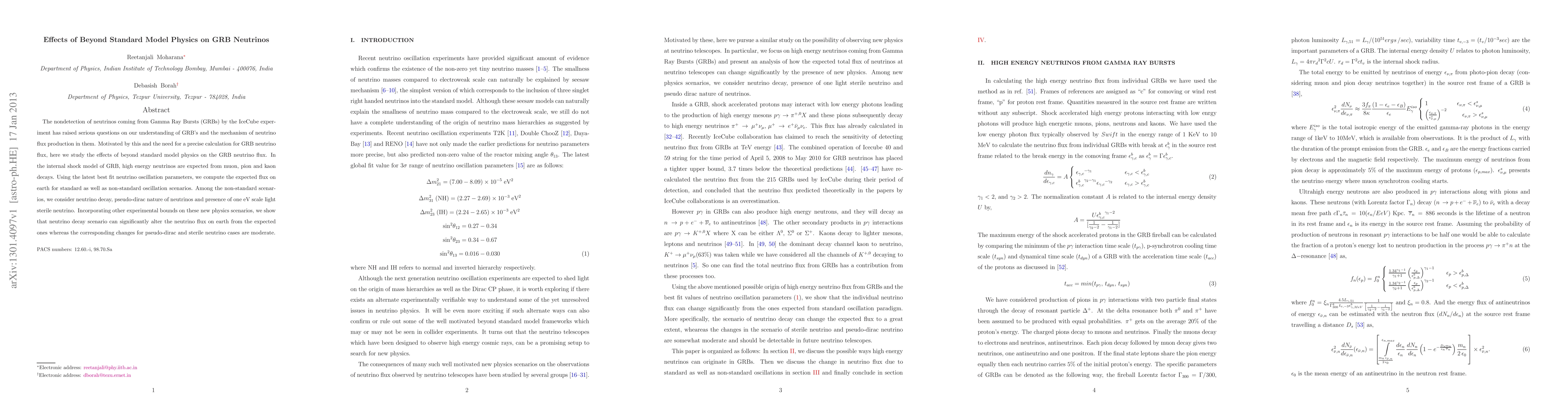 A study investigates how beyond Standard Model physics affects Gamma Ray Bursts' neutrino flux, finding that neutrino decay alters the expected flux significantly, while pseudo-dirac and sterile neutrino effects have moderate changes.