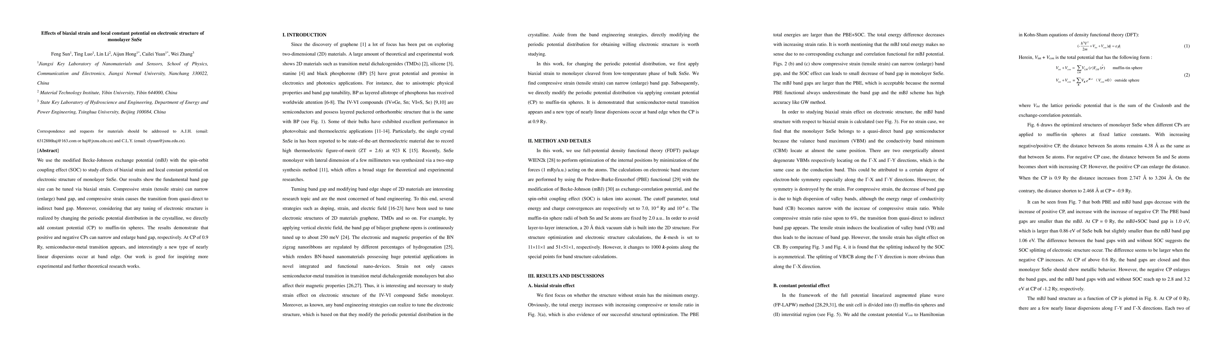This paper investigates how biaxial strain and local constant potential influence the electronic structure of monolayer SnSe using the mBJ potential with SOC. Findings reveal that biaxial strain can tune the fundamental band gap, with compressive strain narrowing it and inducing a transition to an indirect band gap, while constant potential can either narrow or enlarge the band gap, causing a semiconductor-metal transition at 0.9 Ry CP and introducing nearly linear dispersions.