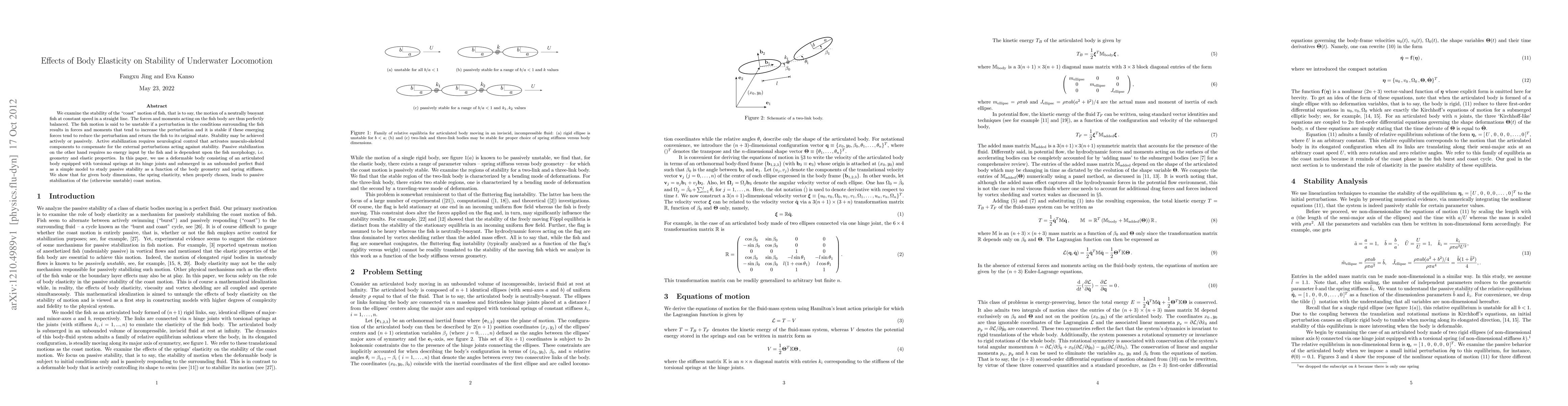 We examine the stability of the "coast" motion of fish, that is to say, the motion of a neutrally buoyant fish at constant speed in a straight line. The forces and moments acting on the fish body are thus perfectly balanced. The fish motion is said to be unstable if a perturbation in the conditions surrounding the fish results in forces and moments that tend to increase the perturbation and it is stable if these emerging forces tend to reduce the perturbation and return the fish to its original state. Stability may be achieved actively or passively. Active stabilization requires neurological control that activates musculo-skeletal components to compensate for the external perturbations acting against stability. Passive stabilization on the other hand requires no energy input by the fish and is dependent upon the fish morphology, i.e. geometry and elastic properties. In this paper, we use a deformable body consisting of an articulated body equipped with torsional springs at its hinge joints and submerged in an unbounded perfect fluid as a simple model to study passive stability as a function of the body geometry and spring stiffness. We show that for given body dimensions, the spring elasticity, when properly chosen, leads to passive stabilization of the (otherwise unstable) coast motion.