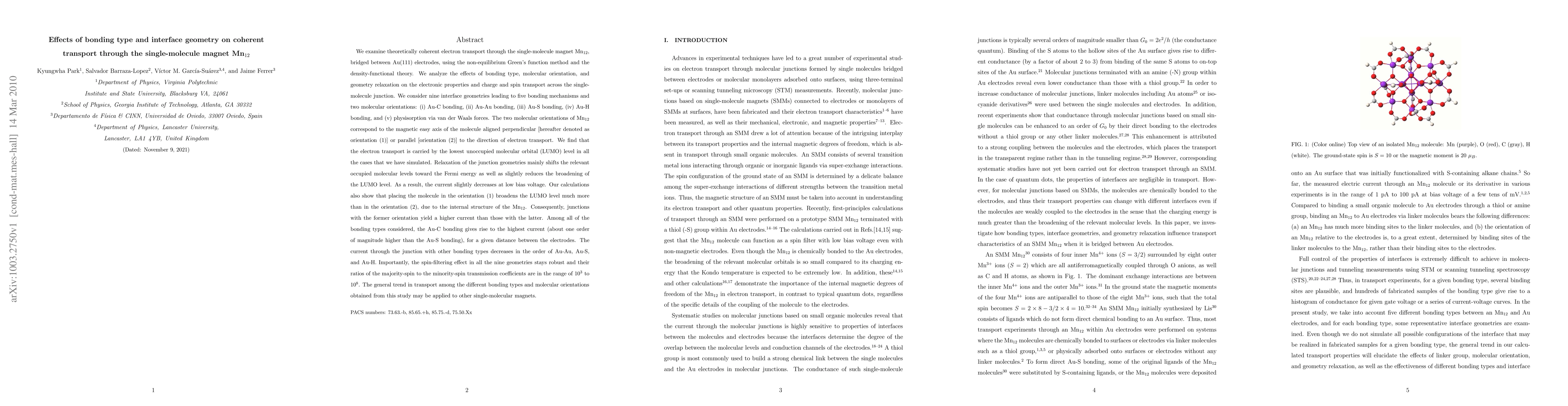 This research theoretically investigates coherent electron transport through Mn₁₂ single-molecule magnets connected between Au(111) electrodes, revealing that Au-C bonding and orientation perpendicular to electron transport yield the highest current. Spin-filtering effects remain robust across all interface geometries, with majority-spin to minority-spin transmission ratios ranging from 10³ to 10⁸.
