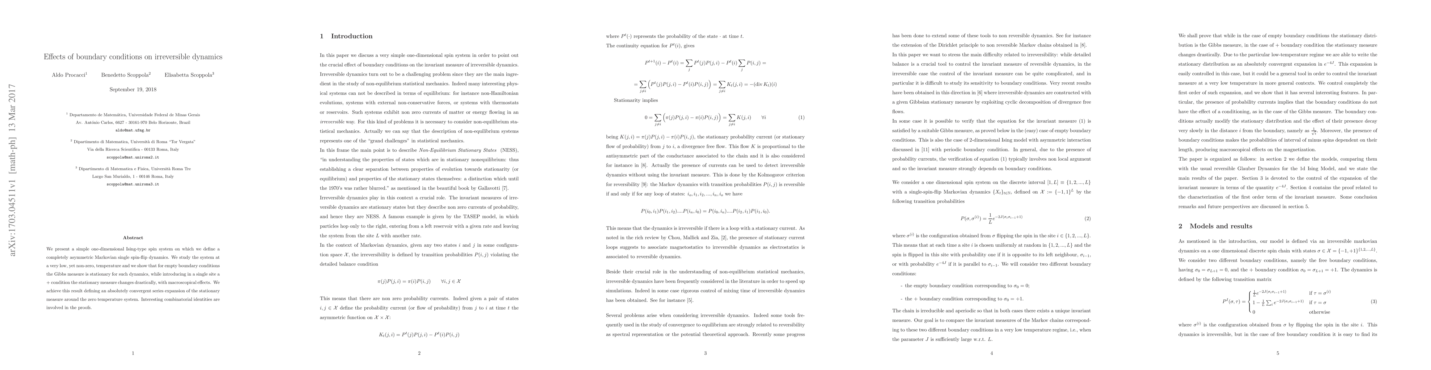 Researchers studied a one-dimensional spin system at low temperature with asymmetric dynamics and found that changing boundary conditions can drastically alter the stationary measure, leading to macroscopic effects.