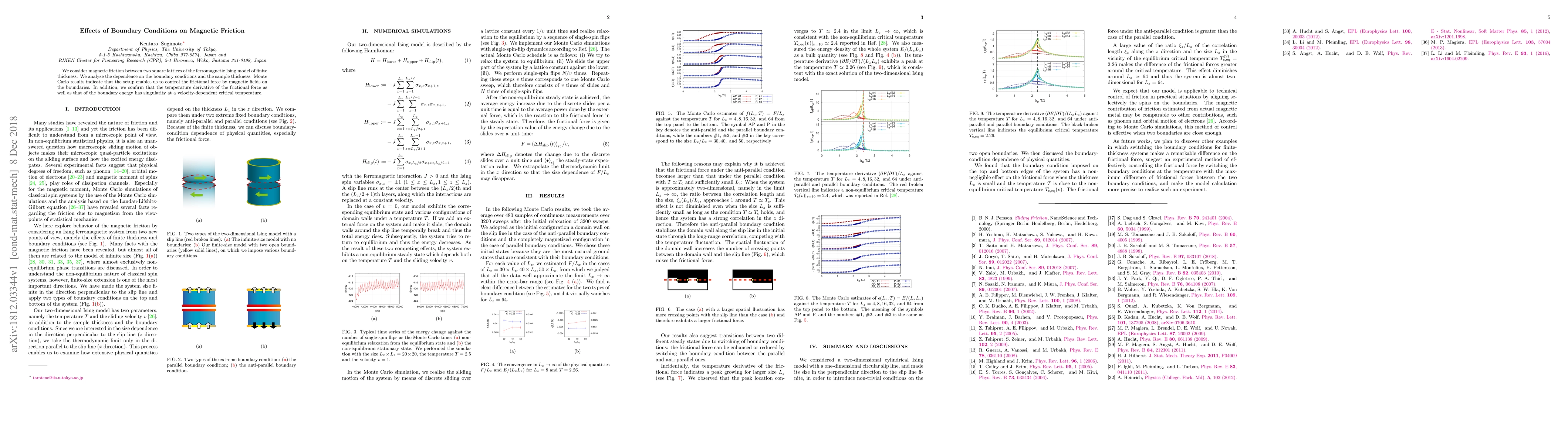 We consider magnetic friction between two square lattices of the ferromagnetic Ising model of finite thickness. We analyze the dependence on the boundary conditions and the sample thickness. Monte Carlo results indicate that the setup enables us to control the frictional force by magnetic fields on the boundaries. In addition, we confirm that the temperature derivative of the frictional force as well as that of the boundary energy has singularity at a velocity-dependent critical temperature.