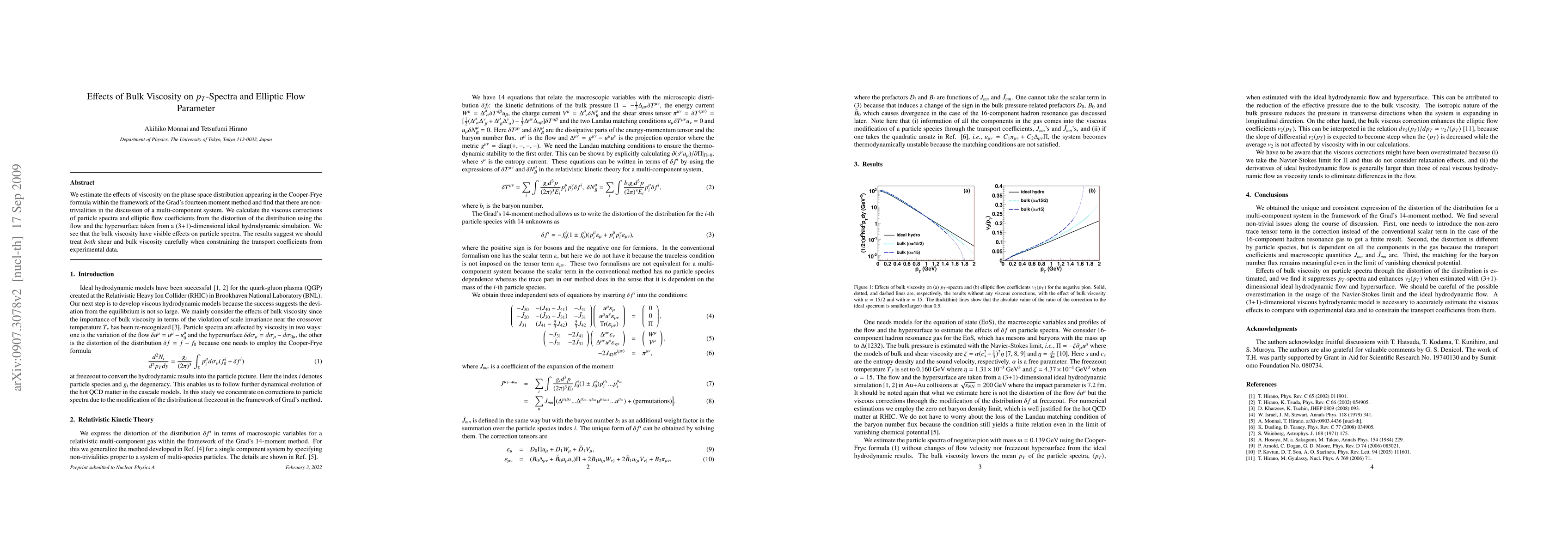We estimate the effects of viscosity on the phase space distribution appearing in the Cooper-Frye formula within the framework of the Grad's fourteen moment method and find that there are non-trivialities in the discussion of a multi-component system. We calculate the viscous corrections of particle spectra and elliptic flow coefficients from the distortion of the distribution using the flow and the hypersurface taken from a (3+1)-dimensional ideal hydrodynamic simulation. We see that the bulk viscosity have visible effects on particle spectra. The results suggest we should treat both shear and bulk viscosity carefully when constraining the transport coefficients from experimental data.