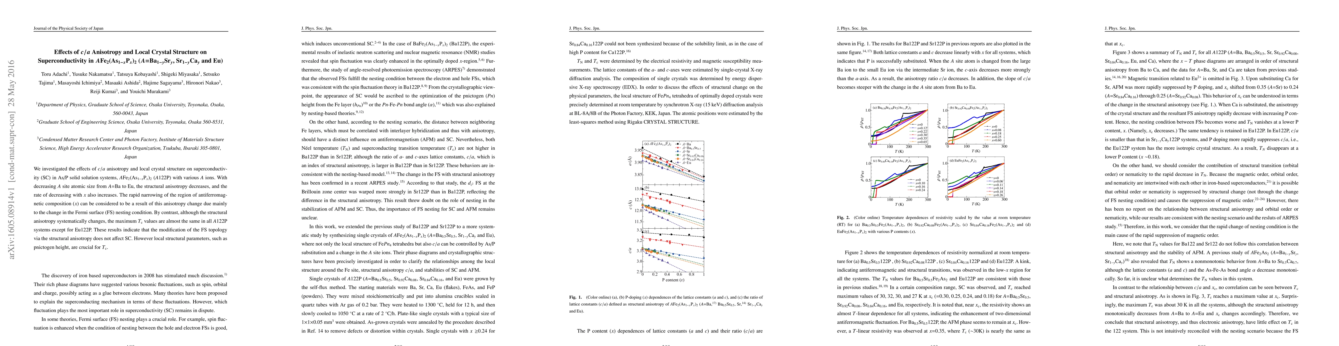 We investigated the effects of $c/a$ anisotropy and local crystal structure on superconductivity (SC) in As/P solid solution systems, $A\mathrm{Fe_{2}}(\mathrm{As}_{1-x}\mathrm{P}_{x}\mathrm{)_{2}}$ ($A$122P) with various $A$ ions. With decreasing $A$ site atomic size from $A$=Ba to Eu, the structural anisotropy decreases, and the rate of decreasing with $x$ also increases. The rapid narrowing of the region of antiferromagnetic composition ($x$) can be considered to be a result of this anisotropy change due mainly to the change in the Fermi surface (FS) nesting condition. By contrast, although the structural anisotropy systematically changes, the maximum $T_{\mathrm{c}}$ values are almost the same in all $A$122P systems except for Eu122P. These results indicate that the modification of the FS topology via the structural anisotropy does not affect SC. However local structural parameters, such as pnictogen height, are crucial for $T_{\mathrm{c}}$.