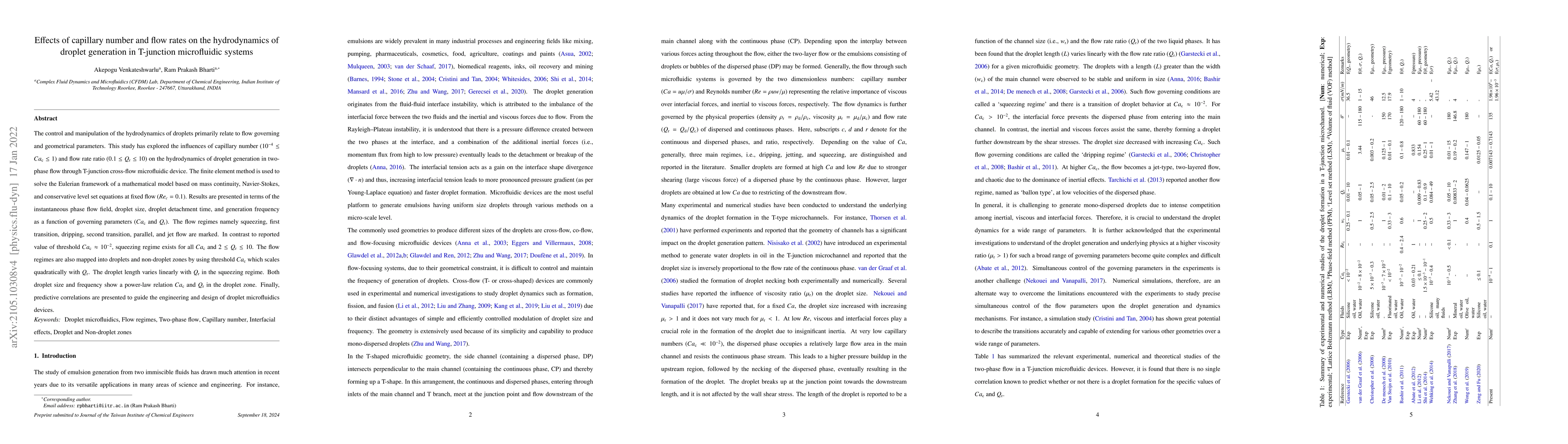 This paper investigates the hydrodynamics of droplet generation in T-junction microfluidic systems, focusing on the effects of capillary number (Ca) and flow rate ratio (Qr) on droplet size, detachment time, and generation frequency. The study employs computational modeling to explore various flow regimes and finds that droplet dynamics are complexly dependent on Ca and Qr, providing valuable insights for the design of microfluidic devices.