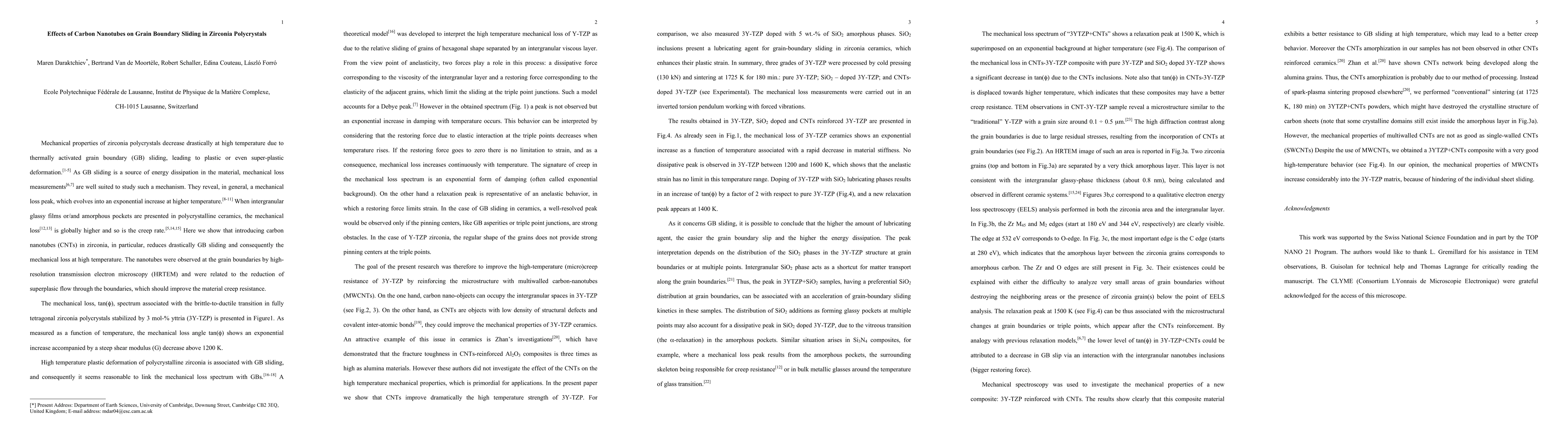 This study investigates how carbon nanotubes reduce grain boundary sliding in zirconia polycrystals, thereby decreasing mechanical loss and enhancing creep resistance at high temperatures. High-resolution microscopy reveals the presence of carbon nanotubes at grain boundaries, correlating with reduced superplastic flow.