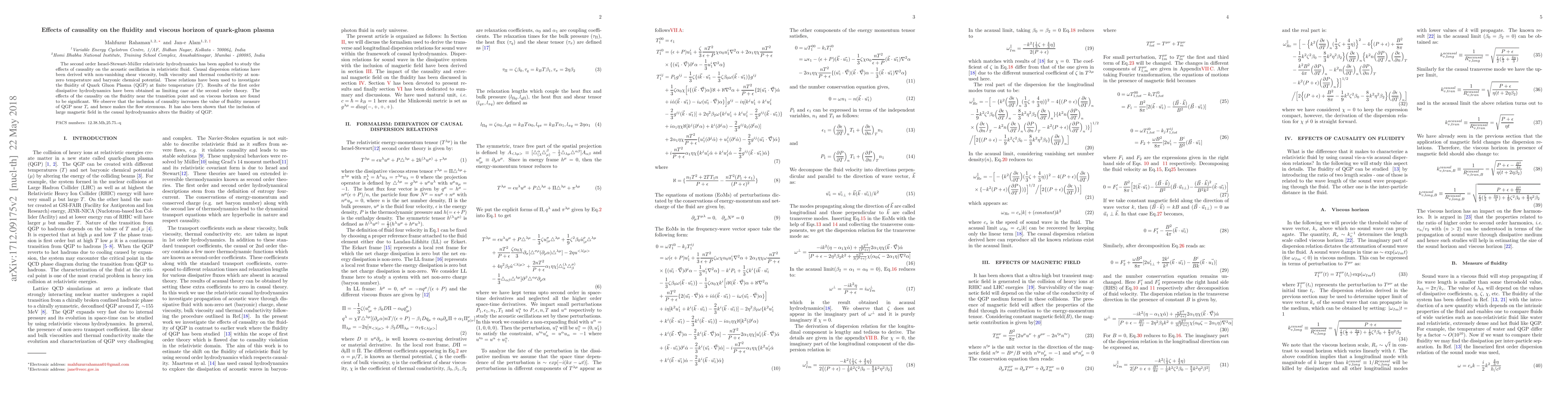 The second order Israel-Stewart-M$\ddot{u}$ller relativistic hydrodynamics has been applied to study the effects of causality on the acoustic oscillation in relativistic fluid. Causal dispersion relations have been derived with non-vanishing shear viscosity, bulk viscosity and thermal conductivity at non-zero temperature and chemical potential. These relations have been used to investigate the fluidity of Quark Gluon Plasma (QGP) at finite temperature ($T$). Results of the first order dissipative hydrodynamics have been obtained as limiting case of the second order theory. The effects of the causality on the fluidity near the transition point and on viscous horizon are found to be significant. We observe that the inclusion of causality reduces the fluidity of QGP. It has also been shown that the inclusion of large magnetic field in the causal hydrodynamics alters the fluidity of QGP