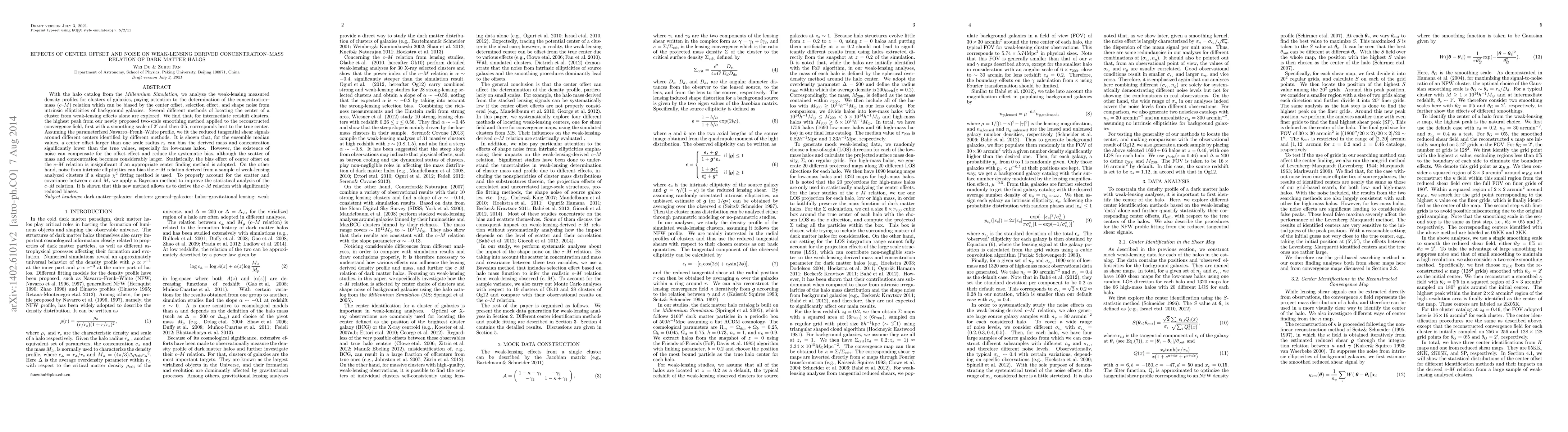Researchers analyzed weak-lensing data to study the concentration-mass relation of dark matter halos, finding that a center offset can bias the results significantly for low-mass halos, but noise from intrinsic ellipticities can also cause errors. A new Bayesian method improved statistical analysis and reduced biases in deriving the concentration-mass relation.