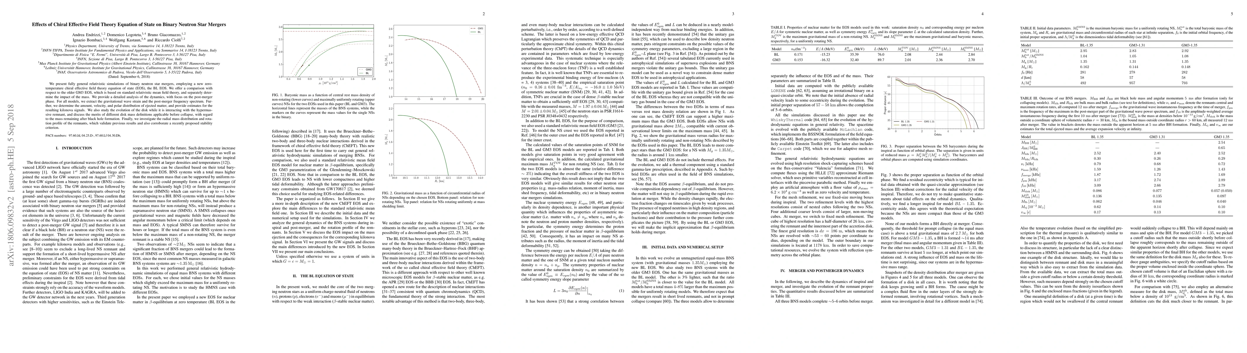 This paper investigates binary neutron star mergers using a new chiral effective field theory equation of state (BL EOS) compared to an older relativistic mean field theory equation of state (GM3). It analyzes the dynamics, gravitational wave signals, ejected matter, and kilonova predictions, and examines the evolution of the post-merger disk and remnant stability.