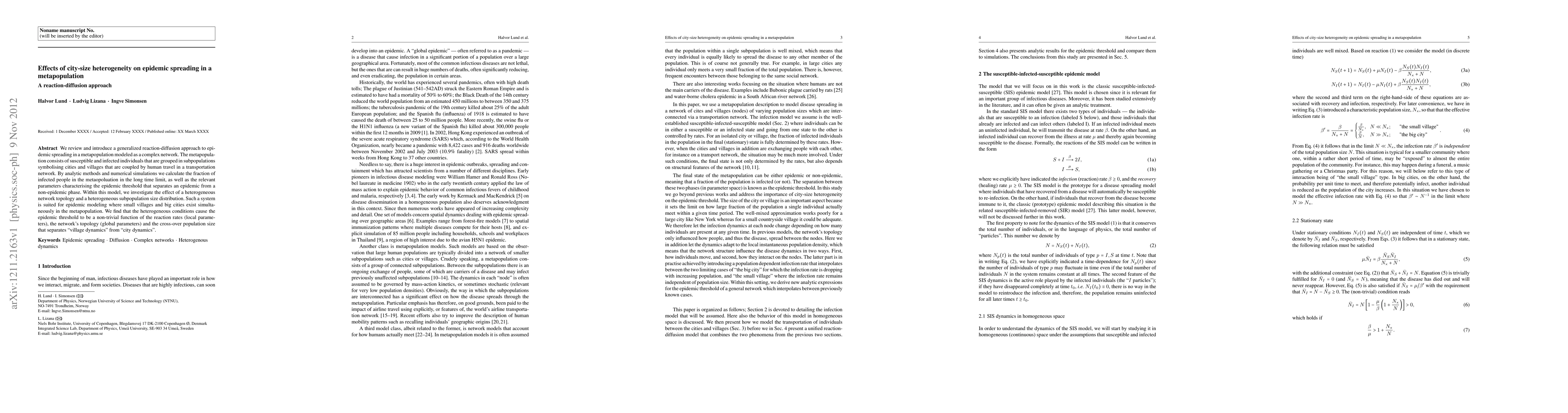 We review and introduce a generalized reaction-diffusion approach to epidemic spreading in a metapopulation modeled as a complex network. The metapopulation consists of susceptible and infected individuals that are grouped in subpopulations symbolising cities and villages that are coupled by human travel in a transportation network. By analytic methods and numerical simulations we calculate the fraction of infected people in the metaopoluation in the long time limit, as well as the relevant parameters characterising the epidemic threshold that separates an epidemic from a non-epidemic phase. Within this model, we investigate the effect of a heterogeneous network topology and a heterogeneous subpopulation size distribution. Such a system is suited for epidemic modeling where small villages and big cities exist simultaneously in the metapopulation. We find that the heterogeneous conditions cause the epidemic threshold to be a non-trivial function of the reaction rates (local parameters), the network's topology (global parameters) and the cross-over population size that separates "village dynamics" from "city dynamics".