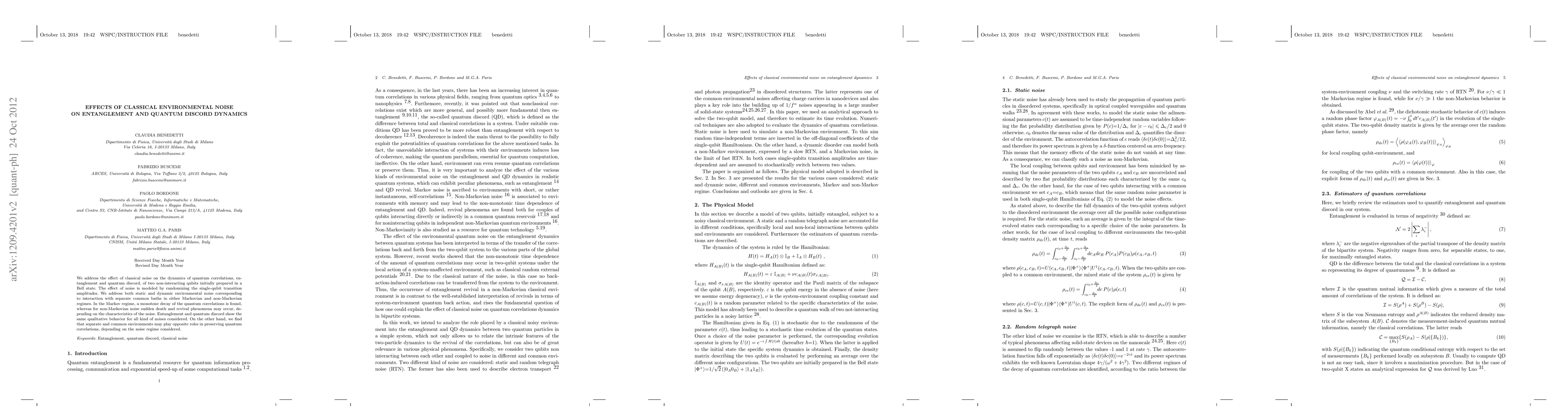 This paper investigates how classical environmental noise affects quantum correlations, entanglement, and quantum discord in two non-interacting qubits. It finds that Markovian noise leads to a monotone decay of quantum correlations, while non-Markovian noise can cause sudden death and revival phenomena, with separate and common environments potentially having opposite roles in preserving quantum correlations.