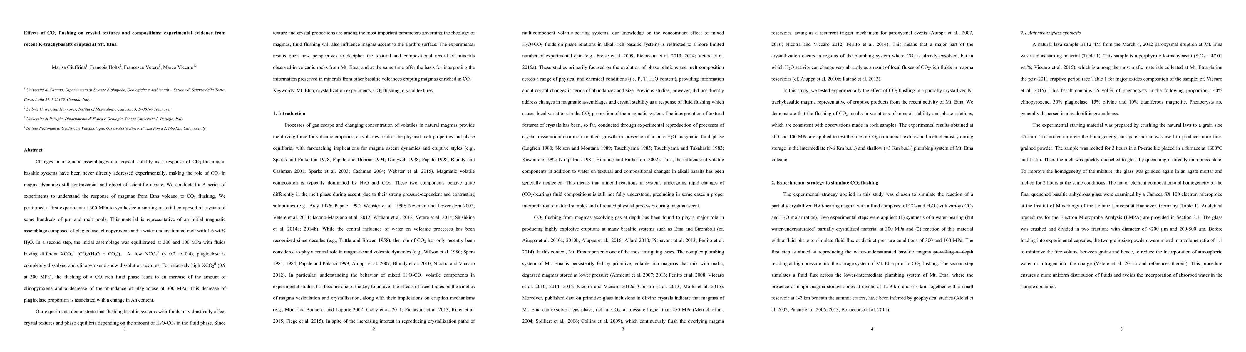 Changes in magmatic assemblages and crystal stability as a response of CO2 flushing in basaltic systems have been never directly addressed experimentally, making the role of CO2 in magma dynamics still controversial and object of scientific debate. We conducted a series of experiments to understand the response of magmas from Etna volcano to CO2 flushing. We performed a first experiment at 300 MPa to synthesize a starting material composed of crystals of some hundreds of m and melt pools. This material is representative of an initial magmatic assemblage composed of plagioclase, clinopyroxene and a water undersaturated melt. In a second step, the initial assemblage was equilibrated at 300 and 100 MPa with fluids having different XCO2fl . Our experiments demonstrate that flushing basaltic systems with fluids may drastically affect crystal textures and phase equilibria depending on the amount of H2O and CO2 in the fluid phase. Since texture and crystal proportions are among the most important parameters governing the rheology of magmas, fluid flushing will also influence magma ascent to the Earths surface. The experimental results open new perspectives to decipher the textural and compositional record of minerals observed in volcanic rocks from Mt. Etna, and at the same time offer the basis for interpreting the information preserved in minerals from other basaltic volcanoes erupting magmas enriched in CO2.