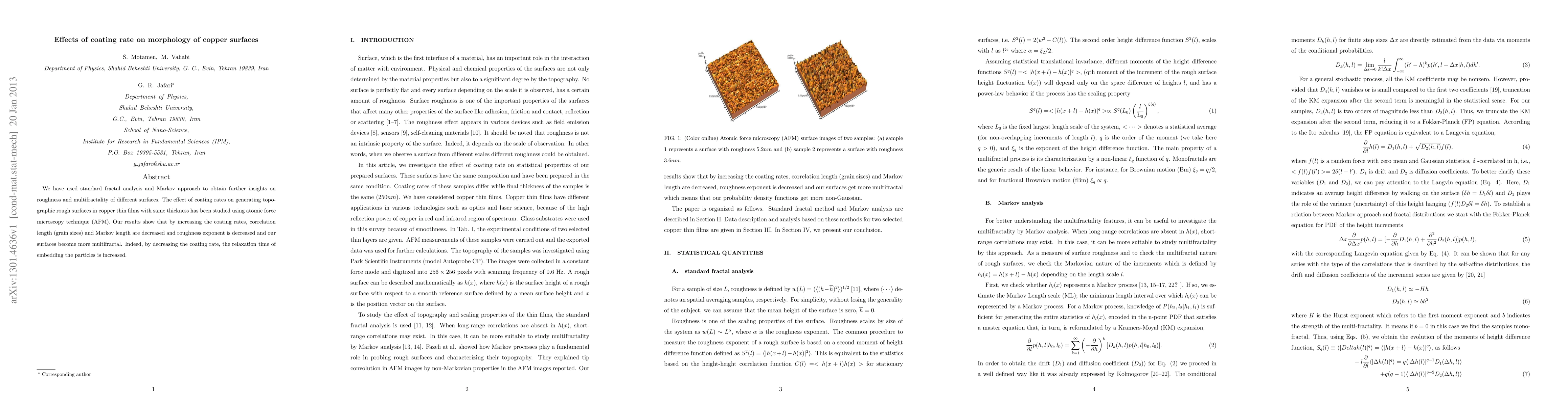 We have used standard fractal analysis and Markov approach to obtain further insights on roughness and multifractality of different surfaces. The effect of coating rates on generating topographic rough surfaces in copper thin films with same thickness has been studied using atomic force microscopy technique (AFM). Our results show that by increasing the coating rates, correlation length (grain sizes) and Markov length are decreased and roughness exponent is decreased and our surfaces become more multifractal. Indeed, by decreasing the coating rate, the relaxation time of embedding the particles is increased.