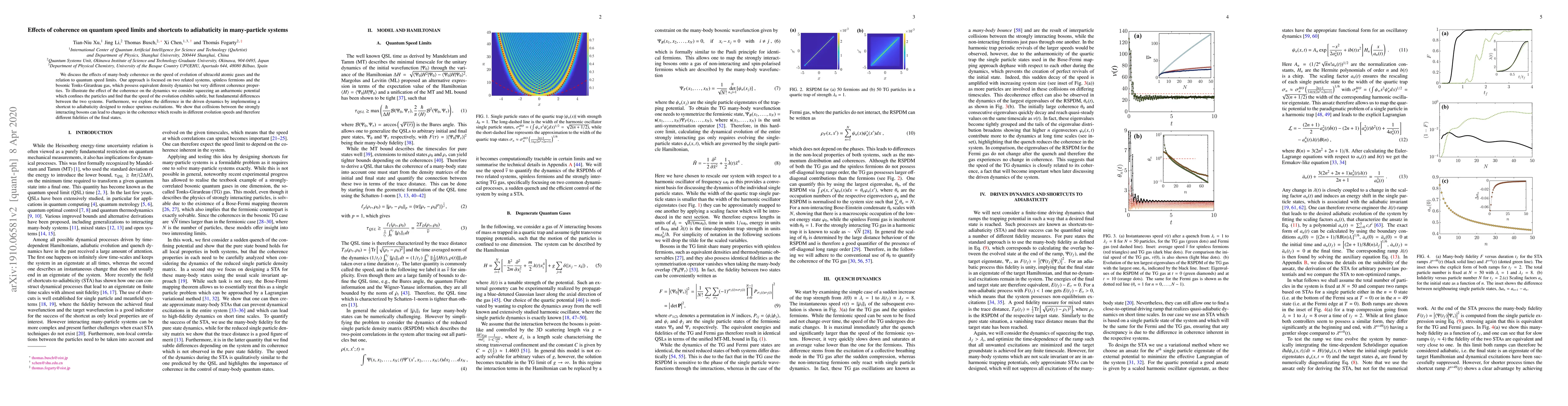 We discuss the effects of many-body coherence on the speed of evolution of ultracold atomic gases and the relation to quantum speed limits. Our approach is focused on two related systems, spinless fermions and the bosonic Tonks-Girardeau gas, which possess equivalent density dynamics but very different coherence properties. To illustrate the effect of the coherence on the dynamics we consider squeezing an anharmonic potential which confines the particles and find that the speed of the evolution exhibits subtle, but fundamental differences between the two systems. Furthermore, we explore the difference in the driven dynamics by implementing a shortcut to adiabaticity designed to reduce spurious excitations. We show that collisions between the strongly interacting bosons can lead to changes in the coherence which results in different evolution speeds and therefore different fidelities of the final states.