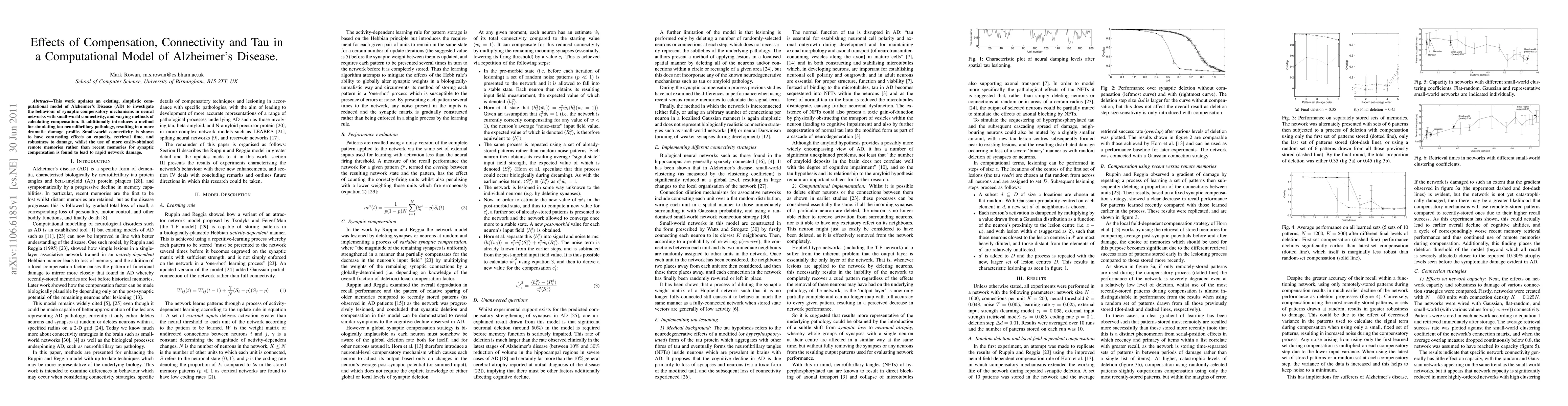 A study updates a model of Alzheimer's Disease to investigate synaptic compensation mechanisms and tau neurofibrillary pathology, finding that small-world connectivity can have contrasting effects on network capacity and robustness, while using recent memories for compensation leads to rapid damage.