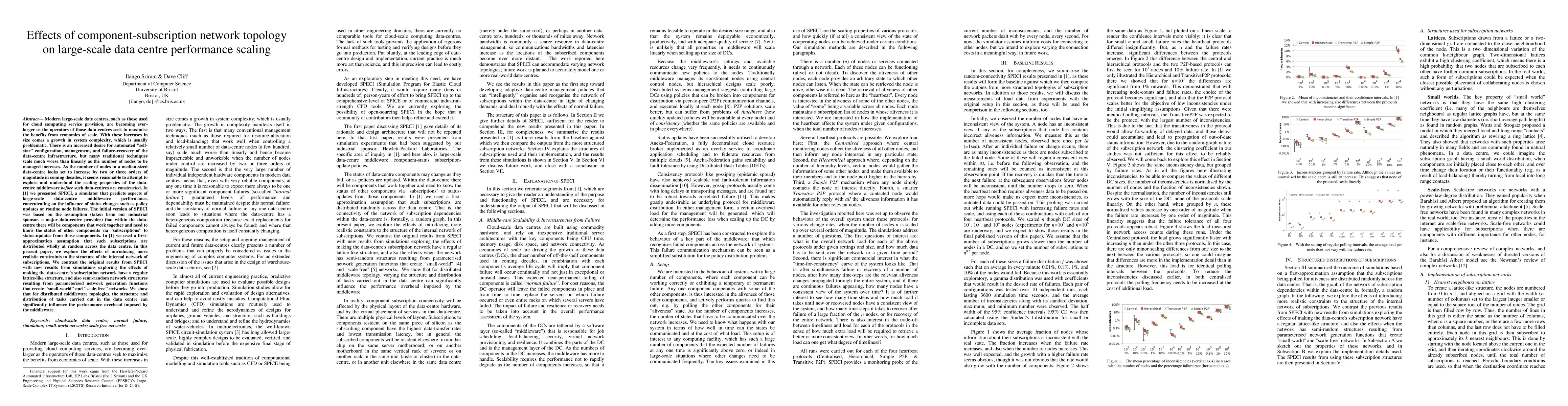 Modern large-scale date centres, such as those used for cloud computing service provision, are becoming ever-larger as the operators of those data centres seek to maximise the benefits from economies of scale. With these increases in size comes a growth in system complexity, which is usually problematic. There is an increased desire for automated "self-star" configuration, management, and failure-recovery of the data-centre infrastructure, but many traditional techniques scale much worse than linearly as the number of nodes to be managed increases. As the number of nodes in a median-sized data-centre looks set to increase by two or three orders of magnitude in coming decades, it seems reasonable to attempt to explore and understand the scaling properties of the data-centre middleware before such data-centres are constructed. In [1] we presented SPECI, a simulator that predicts aspects of large-scale data-centre middleware performance, concentrating on the influence of status changes such as policy updates or routine node failures. [...]. In [1] we used a first-approximation assumption that such subscriptions are distributed wholly at random across the data centre. In this present paper, we explore the effects of introducing more realistic constraints to the structure of the internal network of subscriptions. We contrast the original results [...] exploring the effects of making the data-centre's subscription network have a regular lattice-like structure, and also semi-random network structures resulting from parameterised network generation functions that create "small-world" and "scale-free" networks. We show that for distributed middleware topologies, the structure and distribution of tasks carried out in the data centre can significantly influence the performance overhead imposed by the middleware.