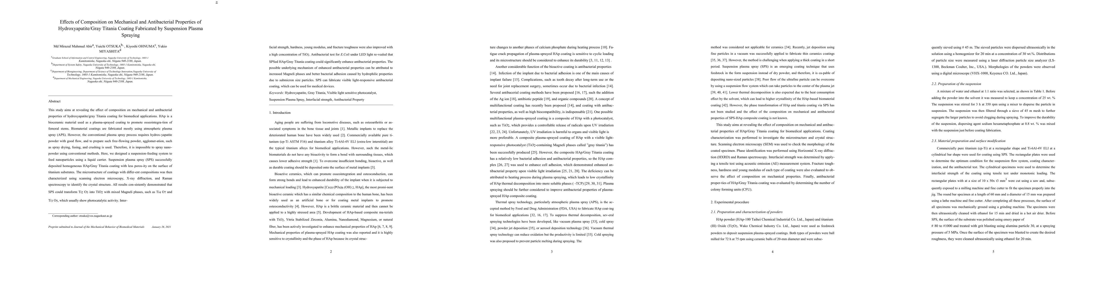 This study aims at revealing the effect of composition on mechanical and antibacterial properties of hydroxyapatite/gray Titania coating for biomedical applications. HAp is a bioceramic material used as a plasma-sprayed coating to promote osseointegra-tion of femoral stems. Biomaterial coatings are fabricated mostly using atmospheric plasma spray (APS). However, the conventional plasma spray process requires hydrox-yapatite powder with good flow, and to prepare such free-flowing powder, agglomer-ation, such as spray drying, fusing, and crushing is used. Therefore, it is impossible to spray nano-powder using conventional methods. Here, we designed a suspension-feeding system to feed nanoparticles using a liquid carrier. Suspension plasma spray (SPS) successfully deposited homogeneous HAp/Gray Titania coating with less poros-ity on the surface of titanium substrates. The microstructure of coatings with differ-ent compositions was then characterized using scanning electron microscopy, X-ray diffraction, and Raman spectroscopy to identify the crystal structure. All results con-sistently demonstrated that SPS could transform Ti2 O3 into TiO2 with mixed Magneli phases, such as Ti4 O7 and Ti3 O5, which usually show photocatalytic activity. Interfacial strength, hardness, young modulus, and fracture toughness were also improved with a high concentration of TiO2. Antibacterial test for E.Coli under LED light re-vealed that SPSed HAp/Gray Titania coating could significantly enhance antibacterial properties. The possible underlying mechanism of enhanced antibacterial properties can be attributed to increased Magneli phases and better bacterial adhesion caused by hydrophilic properties due to submicron size particles. SPS can fabricate visible light-responsive antibacterial coating, which can be used for medical devices.