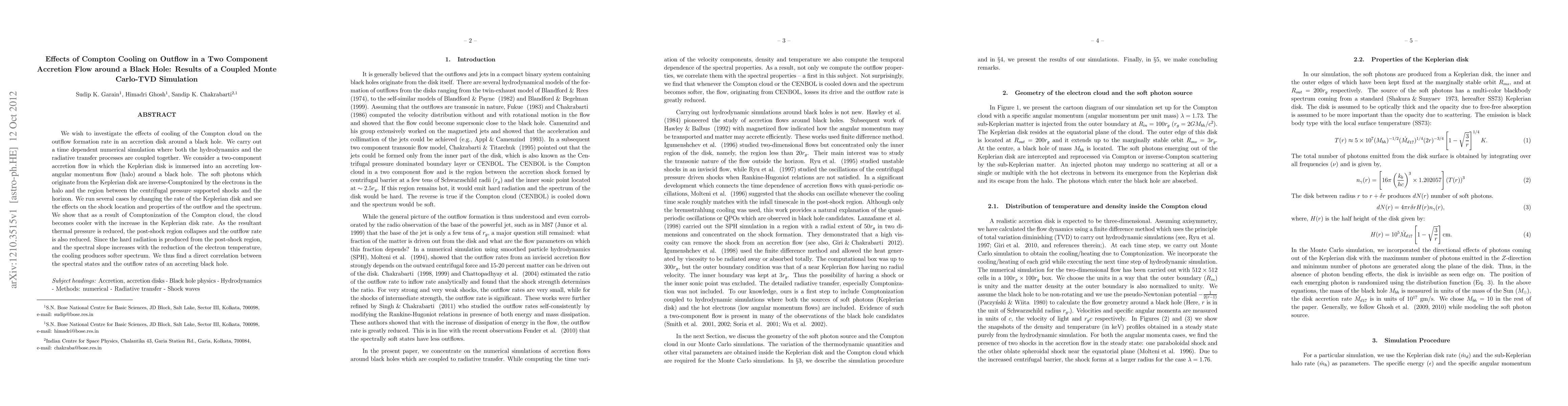 We wish to investigate the effects of cooling of the Compton cloud on the outflow formation rate in an accretion disk around a black hole. We carry out a time dependent numerical simulation where both the hydrodynamics and the radiative transfer processes are coupled together. We consider a two-component accretion flow in which the Keplerian disk is immersed into an accreting low-angular momentum flow (halo) around a black hole. The soft photons which originate from the Keplerian disk are inverse-Comptonized by the electrons in the halo and the region between the centrifugal pressure supported shocks and the horizon. We run several cases by changing the rate of the Keplerian disk and see the effects on the shock location and properties of the outflow and the spectrum. We show that as a result of Comptonization of the Compton cloud, the cloud becomes cooler with the increase in the Keplerian disk rate. As the resultant thermal pressure is reduced, the post-shock region collapses and the outflow rate is also reduced. Since the hard radiation is produced from the post-shock region, and the spectral slope increases with the reduction of the electron temperature, the cooling produces softer spectrum. We thus find a direct correlation between the spectral states and the outflow rates of an accreting black hole.