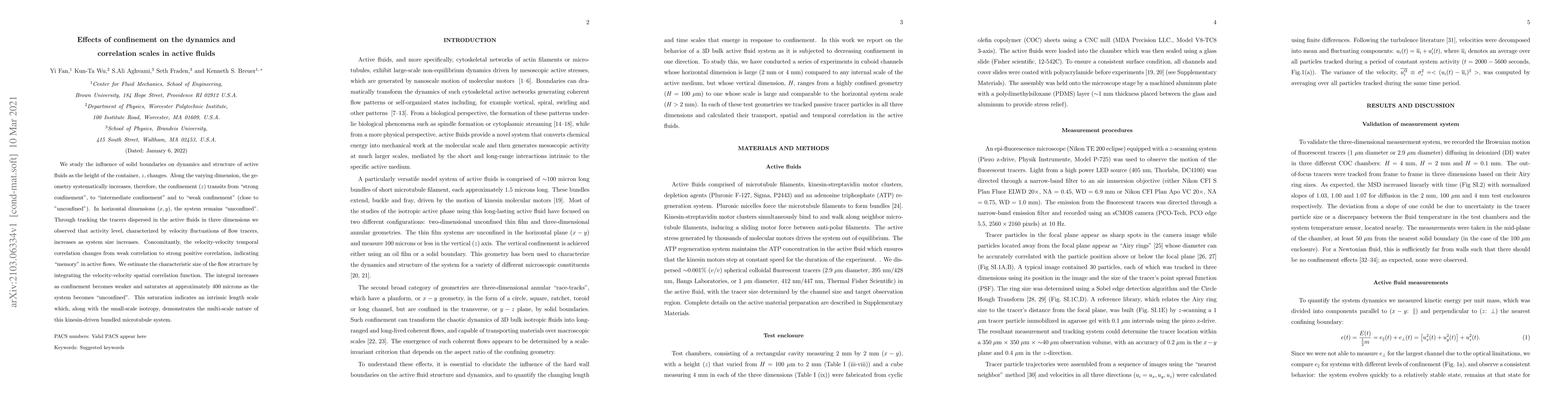 We study the influence of solid boundaries on dynamics and structure of active fluids as the height of the container, $z$, changes. Along the varying dimension, the geometry systematically increases, therefore, the confinement ($z$) transits from "strong confinement", to "intermediate confinement" and to "weak confinement" (close to "unconfined"). In horizontal dimensions ($x,y$), the system remains "unconfined". Through tracking the tracers dispersed in the active fluids in three dimensions we observed that activity level, characterized by velocity fluctuations of flow tracers, increases as system size increases. Concomitantly, the velocity-velocity temporal correlation changes from weak correlation to strong positive correlation, indicating "memory" in active flows. We estimate the characteristic size of the flow structure by integrating the velocity-velocity spatial correlation function. The integral increases as confinement becomes weaker and saturates at approximately 400 microns as the system becomes "unconfined". This saturation indicates an intrinsic length scale which, along with the small-scale isotropy, demonstrates the multi-scale nature of this kinesin-driven bundled microtubule system.