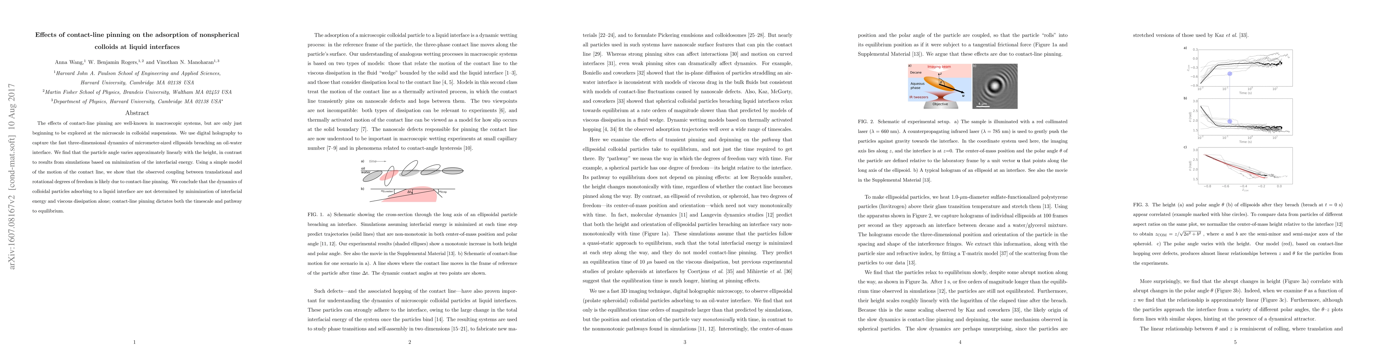 Research using digital holography reveals that contact-line pinning affects how micrometer-sized ellipsoids adsorb to liquid interfaces, altering the particle's angle with height and introducing coupling between translational and rotational degrees of freedom.